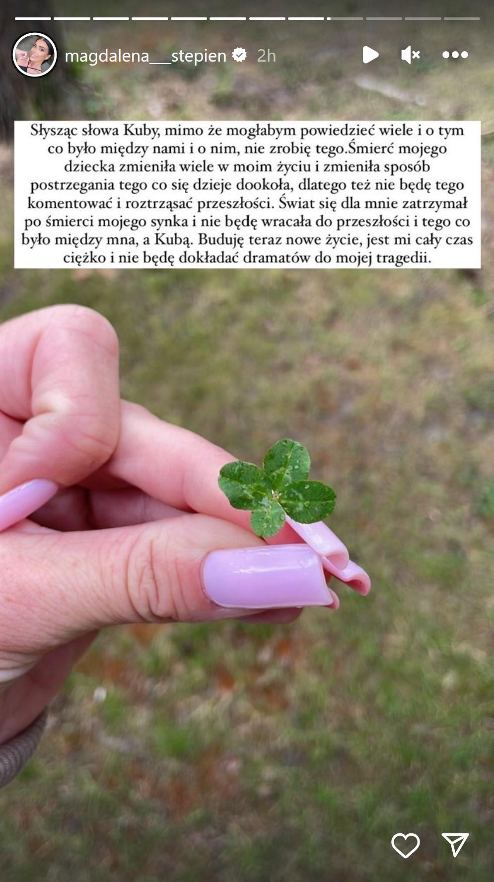 Zupełnie inną strategię obrała Magda Stępień, która na swoim Instagramie opublikowała krótkie oświadczenie, podkreślając, że nie zamierza kolejny raz poruszać tematu swojego ex-partnera: