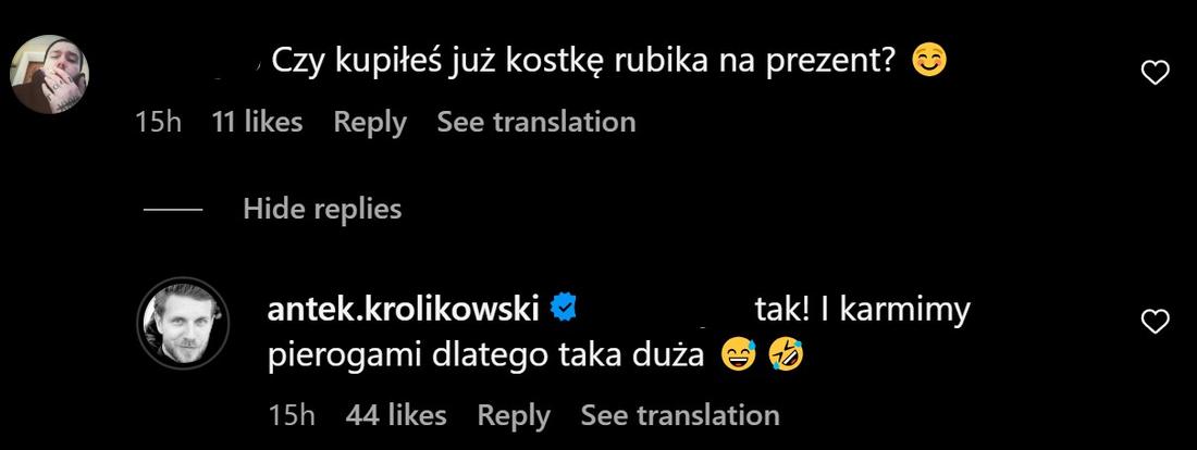 Na jeden z komentarzy Antek zdecydował się odpowiedzieć – internauta zdecydował się nawiązać do oskarżeń Joanny Opozdy, która po narodzinach Vincenta zasugerowała, że Królikowski nie umie zajmować się dzieckiem.