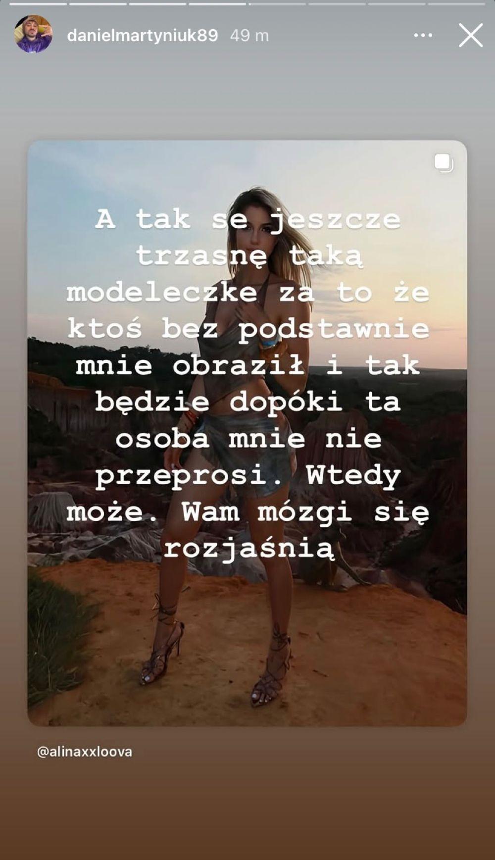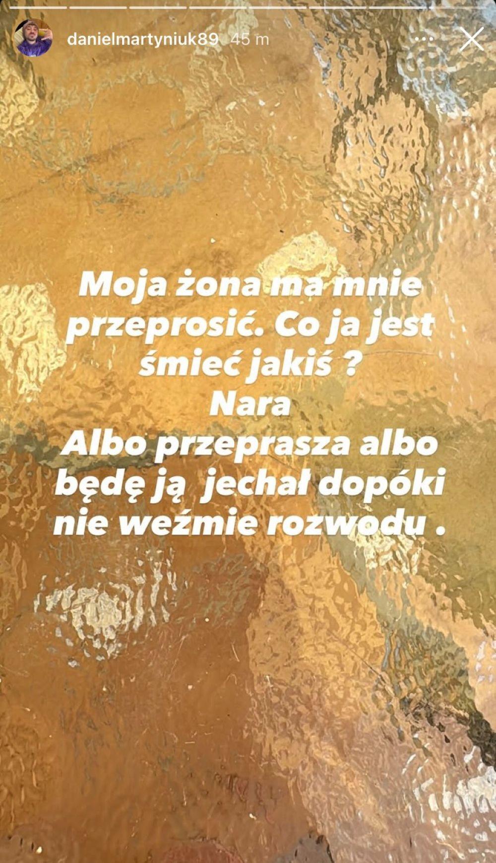 Moja żona ma mnie przeprosić. Co ja jest śmieć jakiś? Nara. Albo przeprasza albo będą ją jechał dopóki nie weźmie rozwodu – pisał Daniel na Instastories.