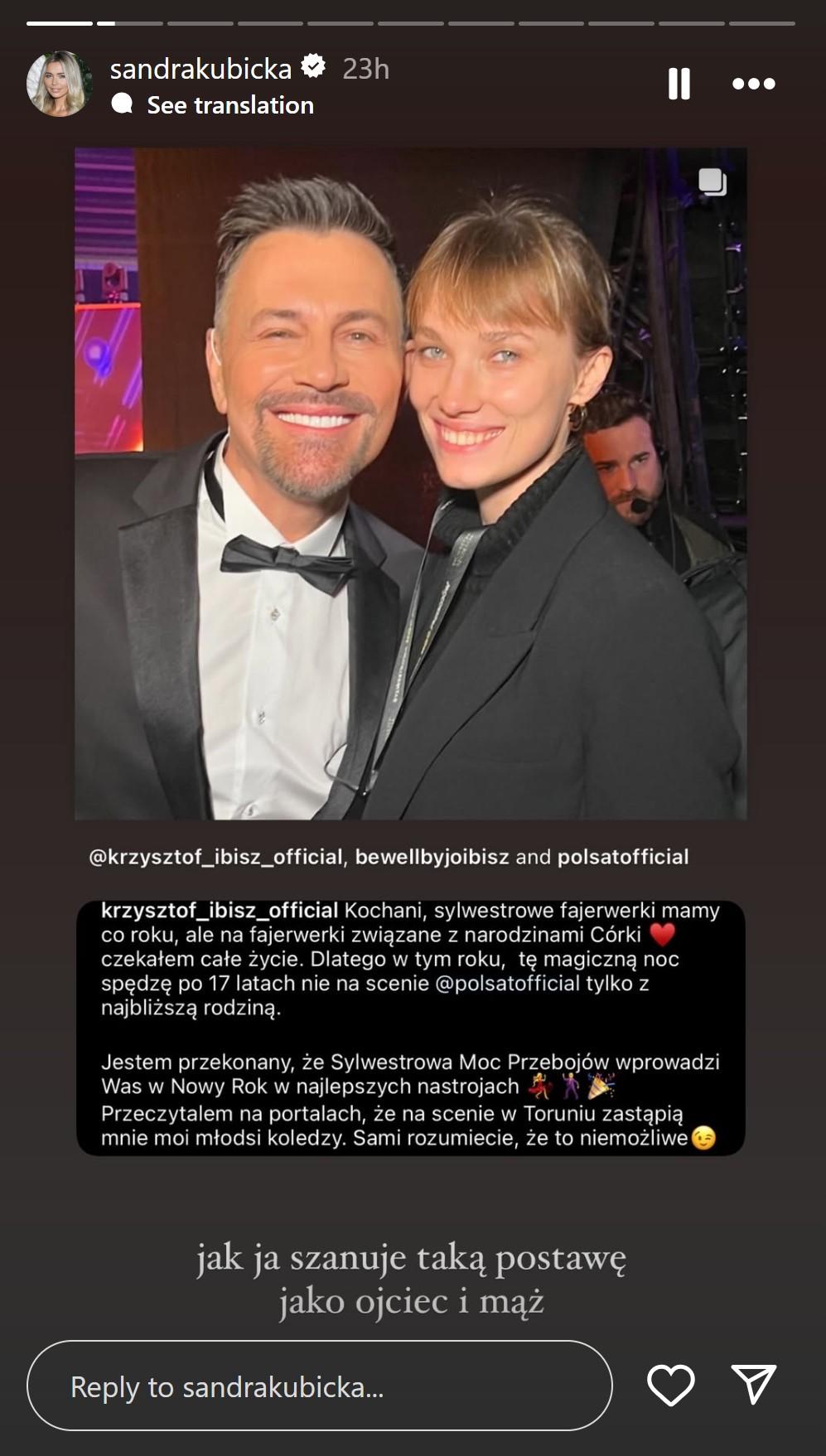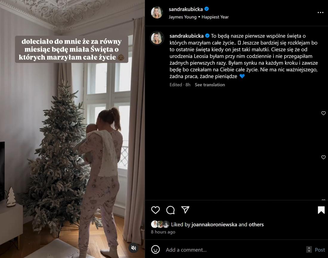 Ostatnio celebrytka opublikowała wymowny wpis na InstaStories, w którym wyraziła podziw dla Krzysztofa Ibisza rezygnującego z prowadzenia koncertów sylwestrowych ze względu na narodziny córki. Następnie Kubicka opublikowała filmik, na którym tuli synka stojąc obok choinki. Do nagrania dodała bardzo wymowny podpis: