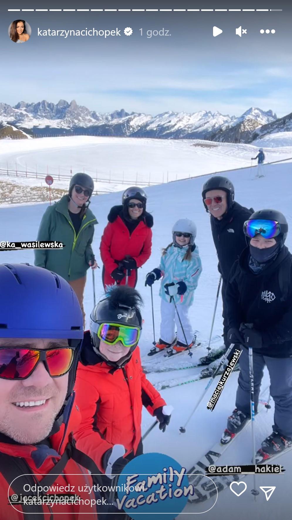 Katarzyna Cichopek z dziećmi i Maciejem Kurzajewskim na nartach we Włoszech