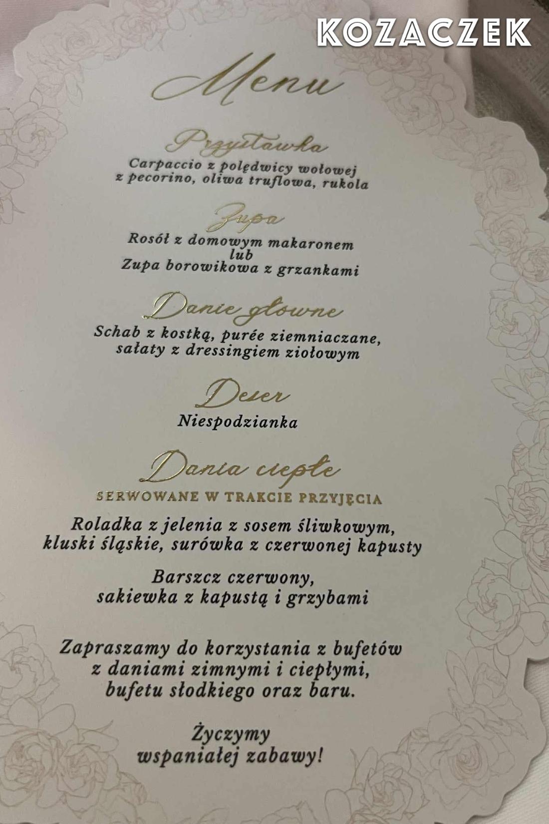 Oprócz zapewnienia gościom wspaniałej imprezy i wielu atrakcji, para zaplanowała skrupulatnie menu. Goście rozpoczęli ucztę od carpaccio z polędwicy wołowej z dodatkiem pecorino, oliwy truflowej i rukoli. Do tego mieli dwie propozycje zupy. W menu znalazły się dwa klasyczne warianty: rosół z domowym makaronem oraz zupa borowikowa z grzankami. W daniu głównym pojawił się domowy akcent. Na ciepło podano schab z kostką, purée ziemniaczane i sałaty z dressingiem ziołowym.