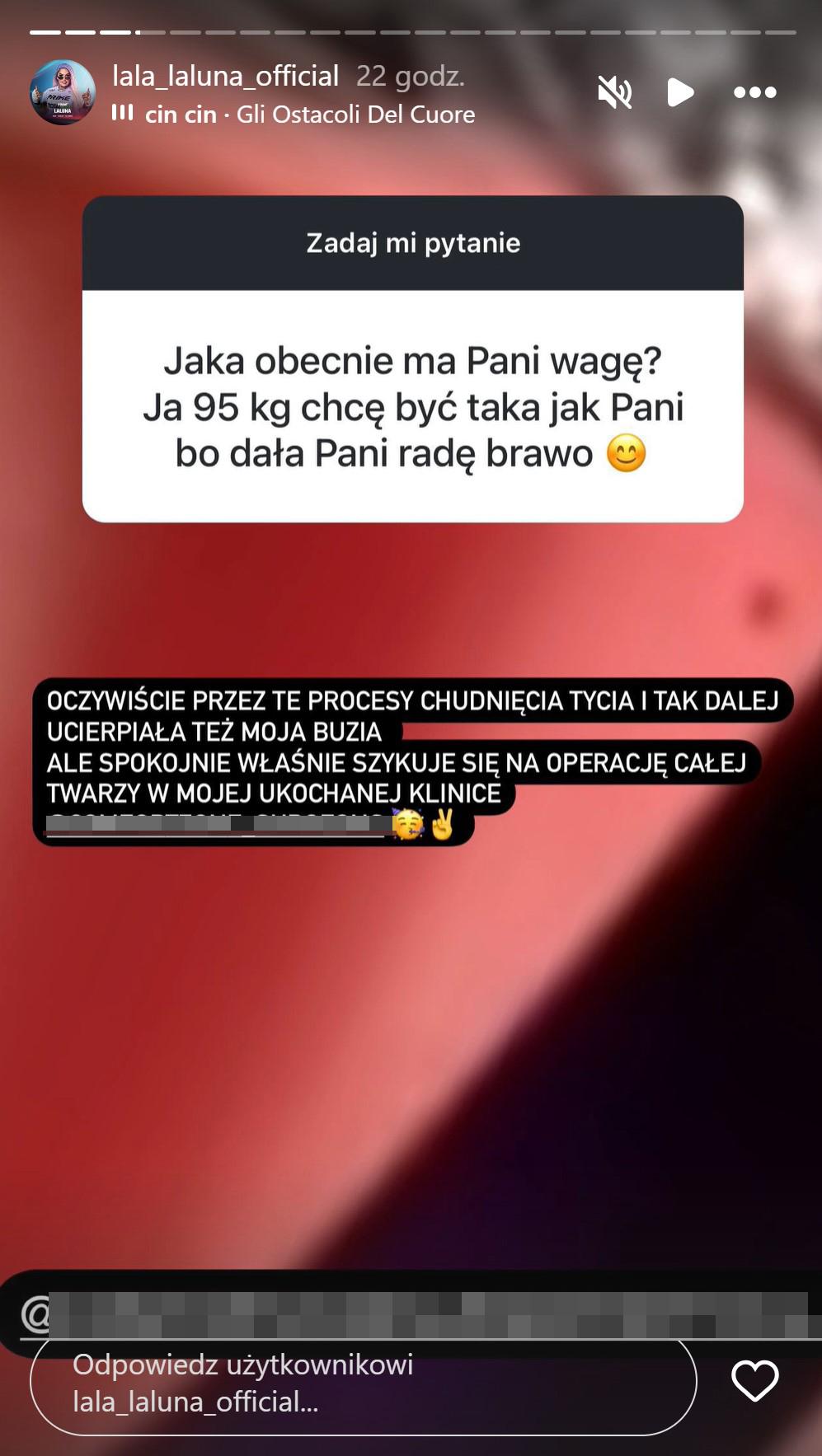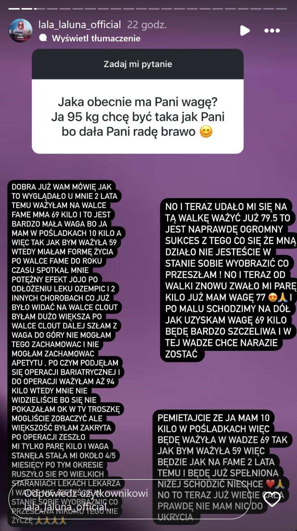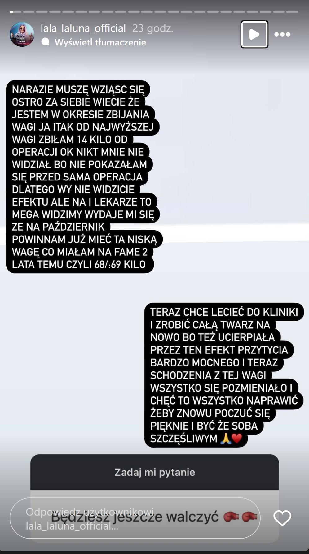 Teraz Laluna zorganizowała instagramowe Q&A, na którym fani mogli jej zadać dowolne pytanie. Wielu internautów korzystając z okazji pogratulowało jej wygranej walki w oktagonie – tydzień temu celebrytka pokonała swoją rywalkę, Wiolę Kotelecką. Jedna z fanek postanowiła zapytać swoją idolkę, czy ta planuje jeszcze zawalczyć we freak fightach. Laluna nie odpowiedziała wprost, a zamiast tego zdobyła się na refleksję na temat swojego wyglądu i wagi podkreślając, że “musi wziąć się za siebie”: