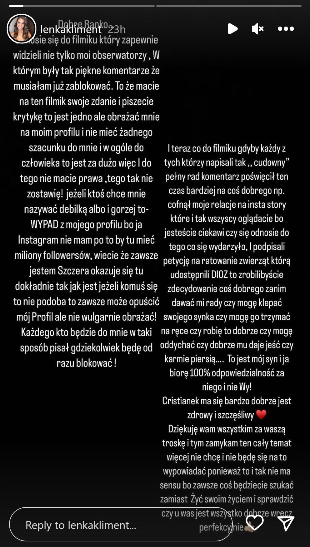 To, że macie na ten filmik swoje zdanie i piszecie krytykę, to jest jedno. Ale obrażać mnie na moim profilu i nie mieć żadnego szacunku do mnie i w ogóle do człowieka – to jest za dużo. Do tego nie macie prawa, tego tak nie zostawię! Jeżeli ktoś chce mnie nazywać debilką albo i gorzej, to WYPAD z mojego profilu, bo ja Instagrama nie mam po to, by tu mieć miliony followersów. (…) Jeżeli komuś się to nie podoba to zawsze może opuścić mój profil, ale nie wulgarnie obrażać! Każdego, kto będzie do mnie w taki sposób pisał gdziekolwiek będę od razu blokować!