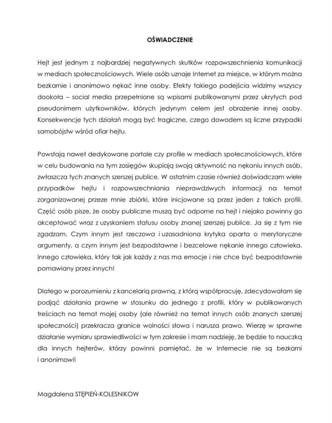 Dlatego w porozumieniu z kancelarią prawną, z którą współpracuję, zdecydowałam się podjąć działania prawne w stosunku do jednego z profili, który w publikowanych treściach na temat mojej osoby (ale również na temat innych osób znanych szerszej społeczności) przekracza granice wolności słowa i narusza prawo. Wierzę w sprawne działanie wymiaru sprawiedliwości w tym zakresie i mam nadzieję, że będzie to nauczką dla innych hejterów, którzy powinni pamiętać, że w Internecie nie są bezkarni i anonimowi!