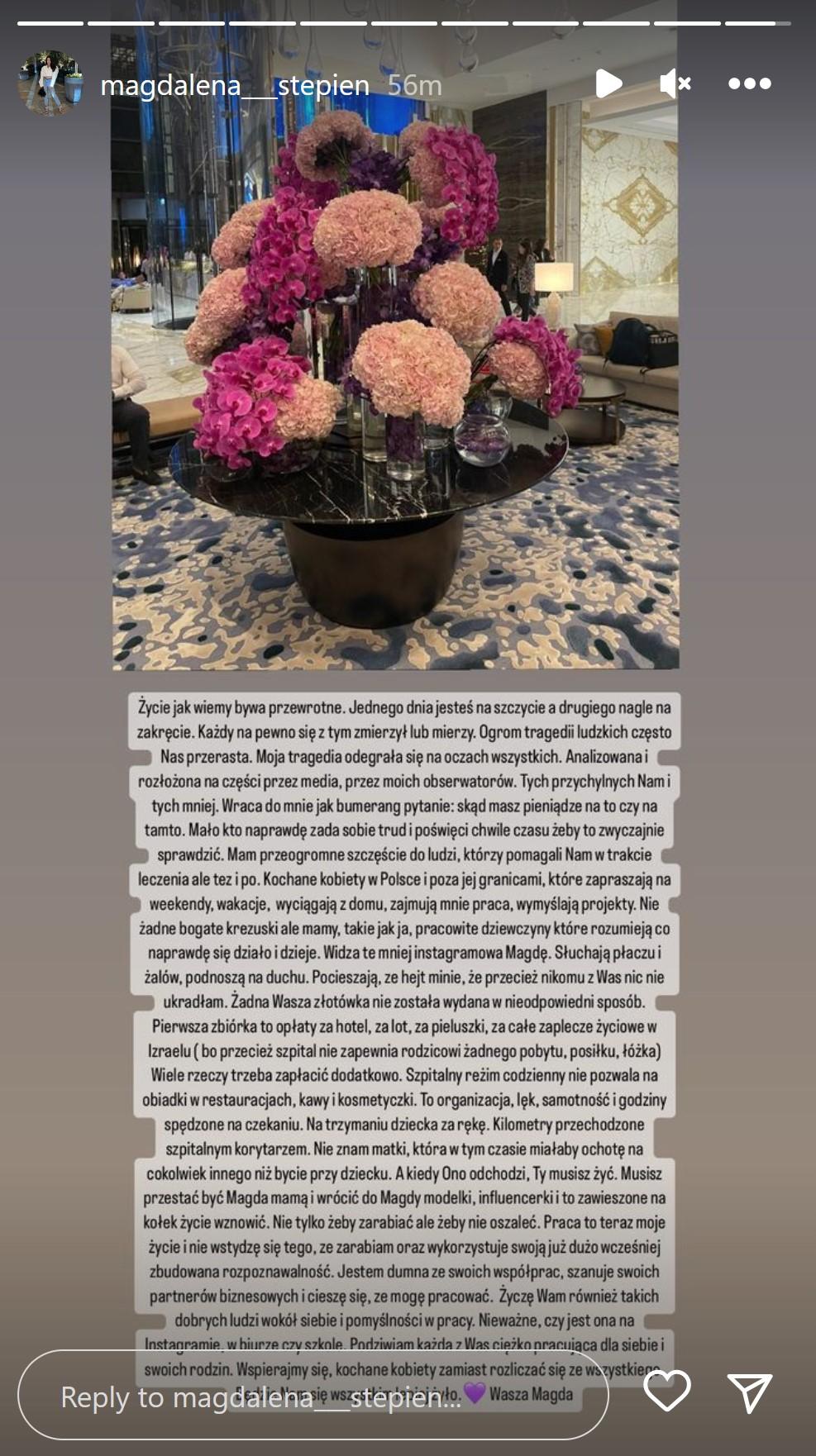 W jednej z nowych relacji Magda Stępień po raz kolejny poruszyła temat zbiórek. Jednocześnie przyznała, że ma ogromne wsparcie od przyjaciół i bliskich, a obecnie pieniądze ma przede wszystkim ze współprac i swojej pracy jako modelka oraz influencerka: