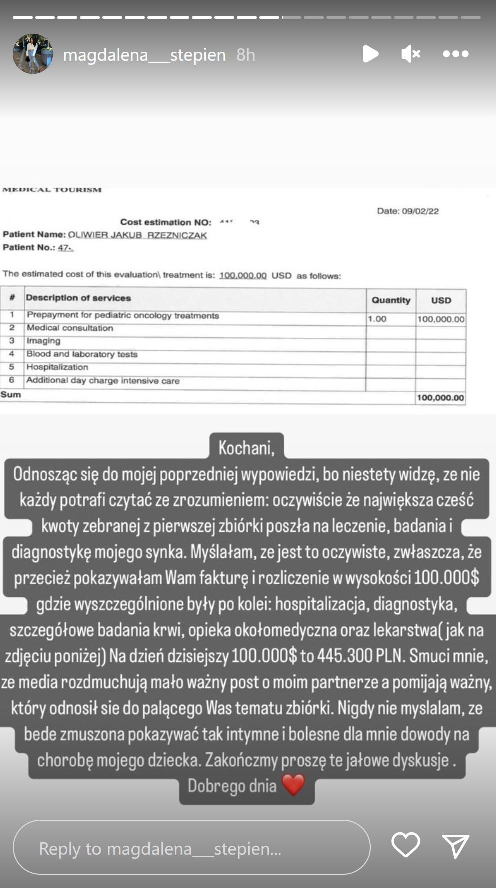 Odnosząc się do mojej poprzedniej wypowiedzi, bo niestety widzę, że nie każdy potrafi czytać ze zrozumieniem: oczywiście, że największa część kwoty zebranej z pierwszej zbiórki poszła na leczenie, badania i diagnostykę mojego synka. Myślałam, że jest to oczywiste, zwłaszcza, że przecież pokazywałam Wam fakturę i rozliczenie w wysokości 100.000$ gdzie wyszczególnione były po kolei: hospitalizacja, diagnostyka, szczegółowe badania krwi, opieka okołomedyczna oraz lekarstwa (jak na zdjęciu poniżej). Na dzień dzisiejszy 100.000$ to 445.300 PLN. Smuci mnie, że media rozdmuchują mało ważny post o moim partnerze, a pomijają ważny, który odnosił się do palącego Was tematu zbiórki. Nigdy nie myślałam, że będę zmuszona pokazywać tak intymne i bolesne dla mnie dowody na chorobę mojego dziecka. Zakończmy proszę te jałowe dyskusje. Dobrego dnia.