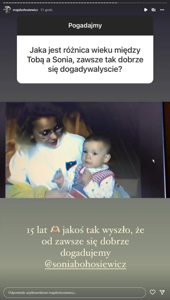 Na koniec zdradziła ile lat róznicy jest między nią, a jej siostrą Sonią. Okazuje się, że między kobietami jest 15 lat różnicy, jednak nigdy nie było to dla nich problemem i obydwie od zawsze dobrze się dogadywały. Do odpowiedzi Maja dołączyła fotkę, na której Sonia trzyma swoją malutką siostrę na kolanach.