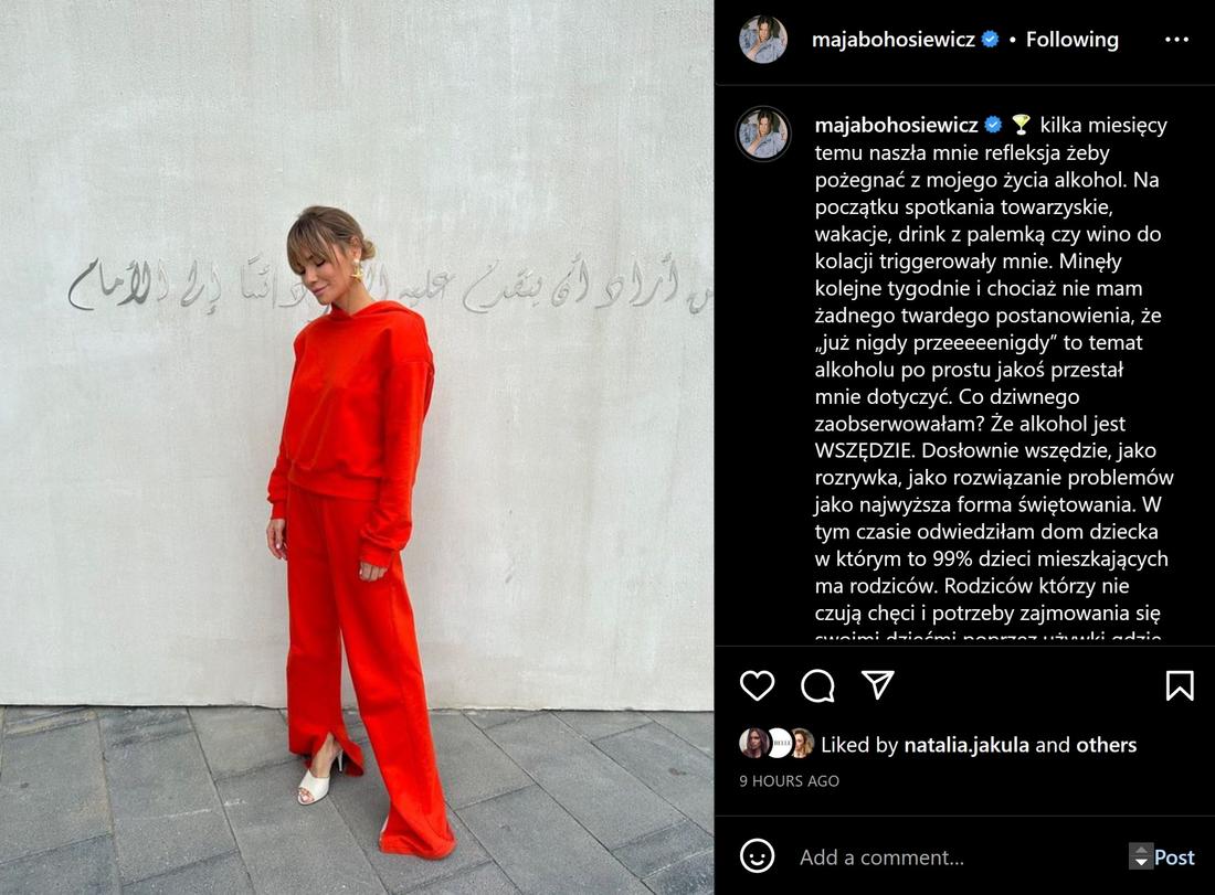 Maja Bohosiewicz jakiś czas temu wywołała prawdziwą burzęw sieci swoim wpisem, w którym postanowiła poruszyć drażliwy i trudny temat alkoholu w przestrzeni publicznej. Celebrytka przyznała, że już jakiś czas temu zdecydowała się na abstynencję, a odkąd sama odstawiła alkohol, dotarło do niej, że jest on nadmiernie promowany w mediach i wręcz wciskany konsumentom, a napoje wysokoprocentowe są ogólnodostępne. Jednoczesnie zwróciła uwagę na problem alkoholizmu i uzależnień w Polsce.