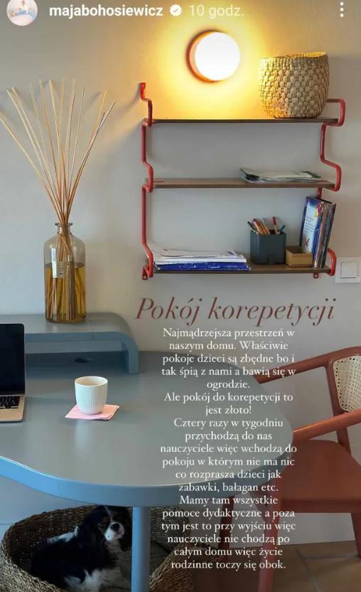 Kiedy usłyszałam o koncepcie osobnego pokoju w domu, blisko wyjścia, tzw. “pokoju korepetycji”, wyśmiałam ten pomysł. Stwierdziłam, że marnowanie metrów kwadratowych, żeby dzieci się w tej przestrzeni uczyły, jest chory – napisała Maja na Instagramie.