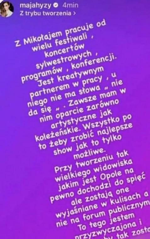 Z Mikołajem pracuję od wielu festiwali, koncertów sylwestrowych, programów, konferencji. Jest kreatywnym partnerem w pracy. U niego nie ma słowa “nie da się”. Zawsze mam w nim oparcie zarówno artystyczne, jak i koleżeńskie. Wszystko po to, żeby zrobić najlepsze show, jak to tylko możliwe. Przy tworzeniu tak wielkiego widowiska, jakim jest Opole, na pewno dochodzi do spięć, ale pozostają one wyjaśniane w kulisach, a nie na forum publicznym. Do tego jestem przyzwyczajona i chciałabym, aby tak zostało.