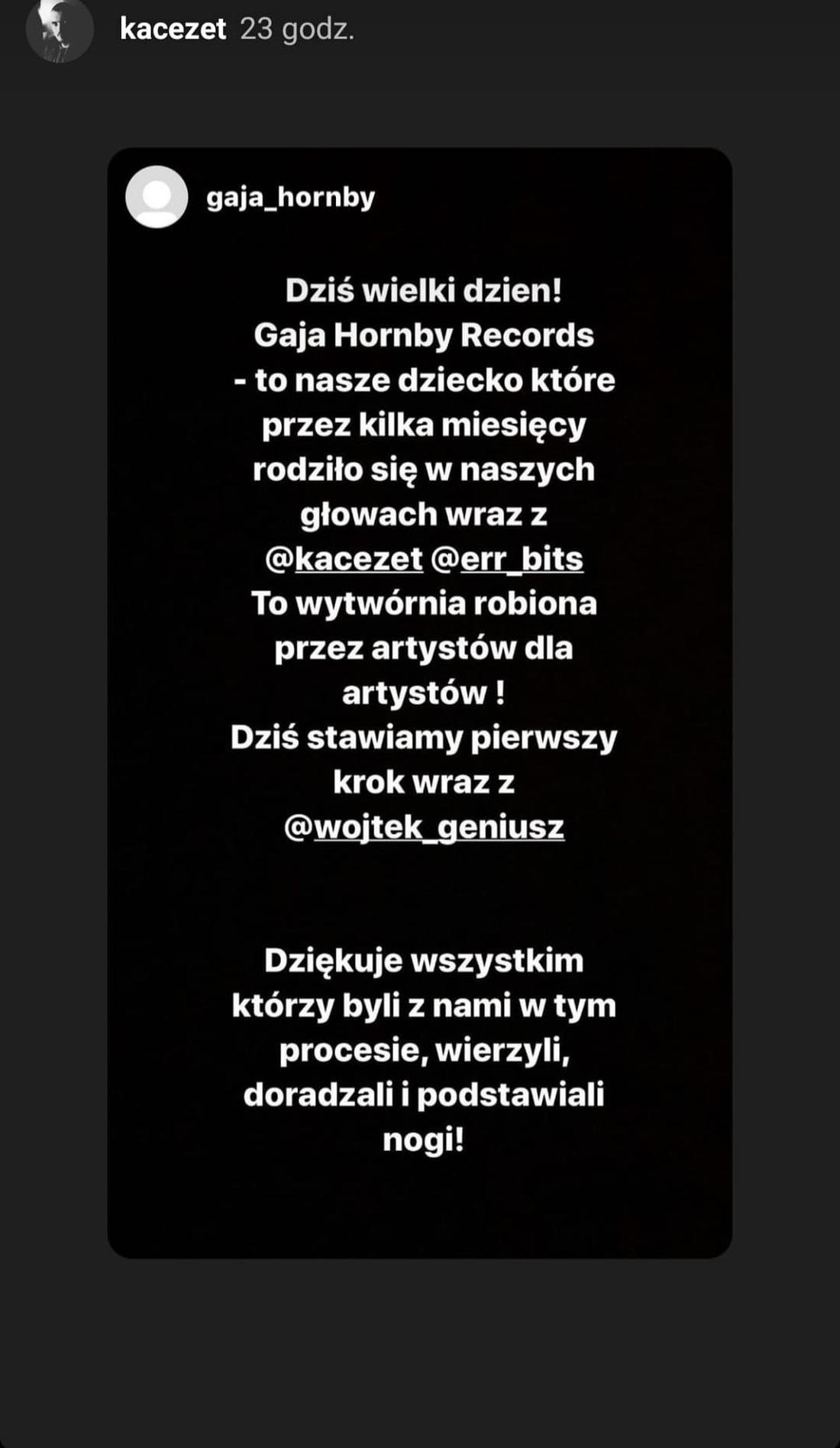 Dziś wielki dzień! Gaja Hornby Records — to nasze dziecko, które przez kilka miesięcy rodziło się w naszych głowach. To wytwórnia robiona przez artystów dla artystów! Dziś stawiamy pierwszy krok wraz z @wojtek_geniusz. Dziękuje wszystkim, którzy byli z nami w tym procesie, wierzyli, doradzali, podstawiali nogi! — czytamy na Instagramie.