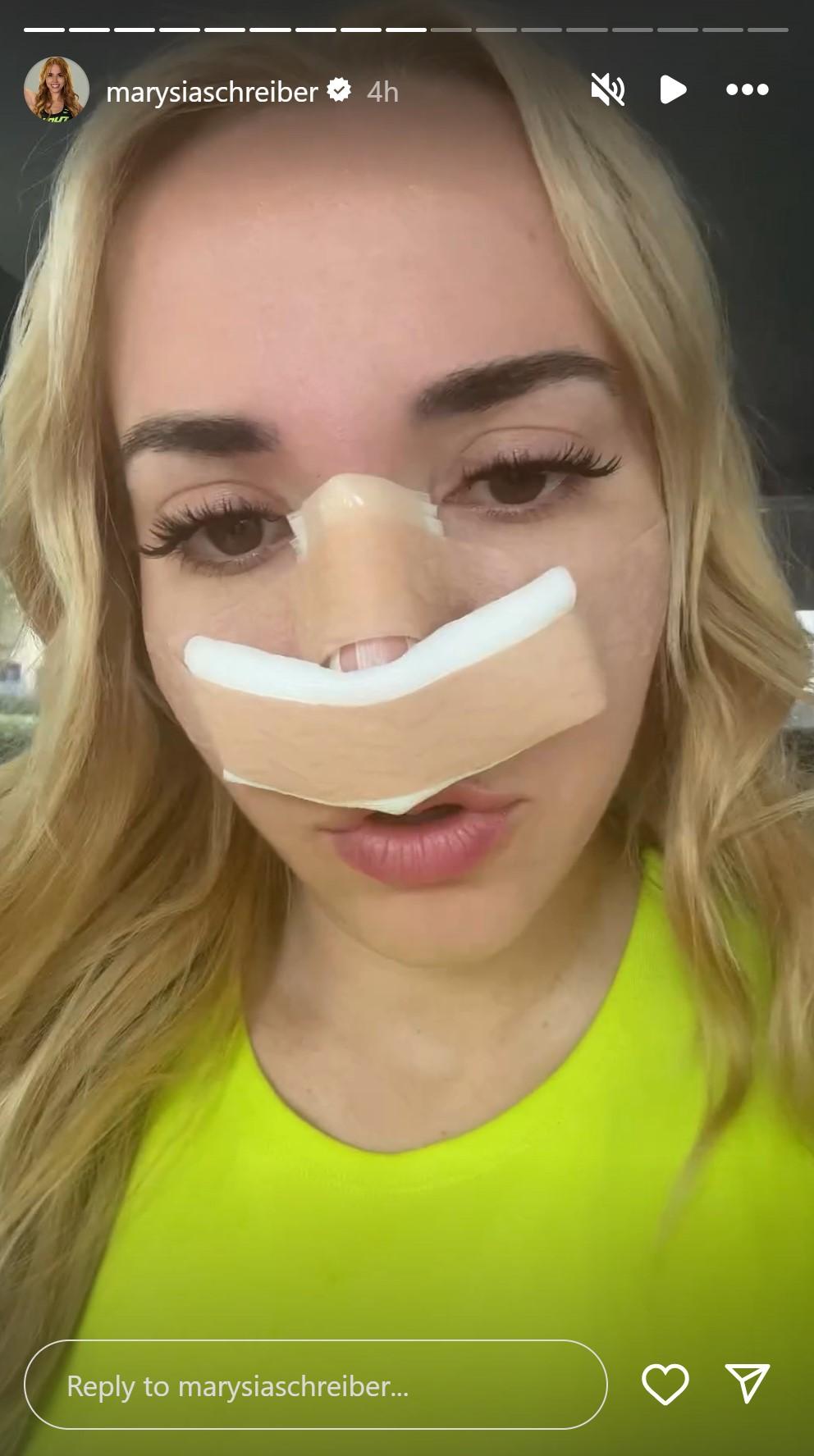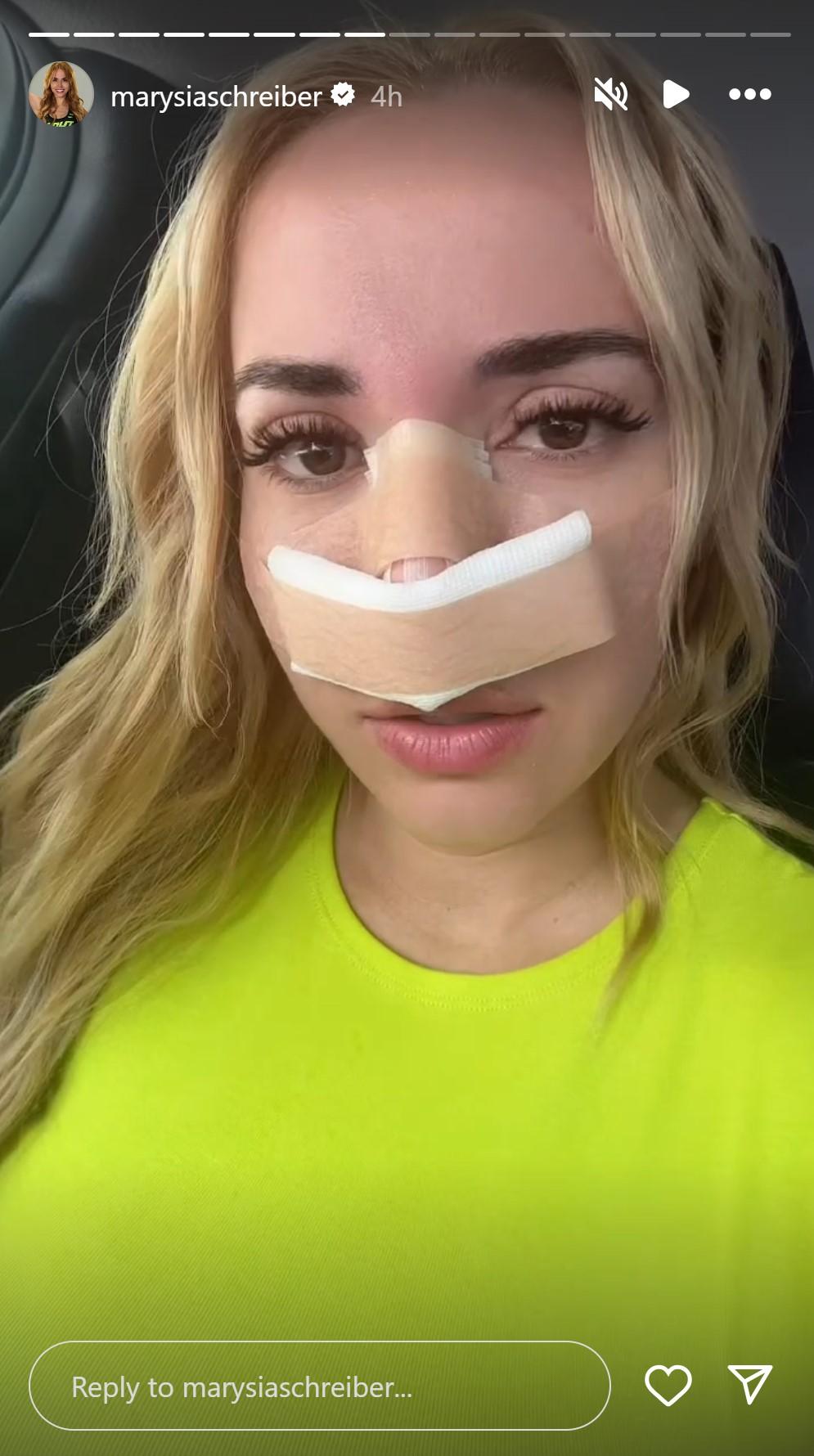 Gdy Schreiber wypuszczono do domu zdecydowała się nie trzymać fanów zbyt długo w niepewności i odezwała się do nich na InstaStories, prezentując do kamery twarz z nosem zasłoniętym opatrunkiem oraz opowiadając o szczegółach zabiegu. Jak podkreśliła, zabieg nie był inwazyjny i trwał zaledwie pół godziny w miejscowym znieczuleniu. Nie była to również całkowita zmiana nosa, a jedynie drobna korekta: