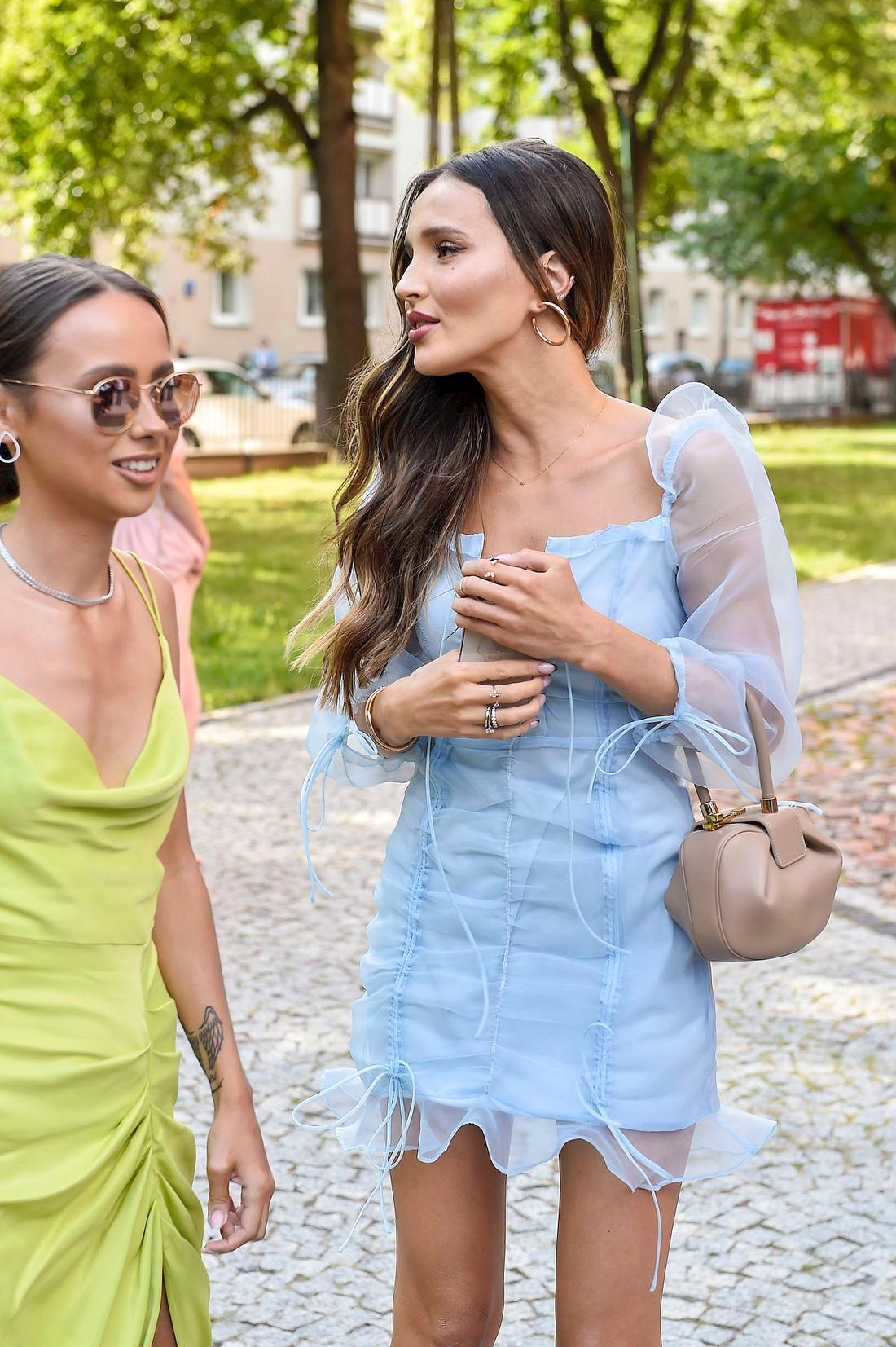 Marina Łuczenko-Szczęsna na tę okazję wybrała krótką, błękitną sukienkę z dłuższymi, transparentnymi rękawami. Odsłoniła zgrabne nogi, na które założyła sandałki na wysokim obcasie. Dopełnieniem stylizacji były kolczyki i designerska torebka.