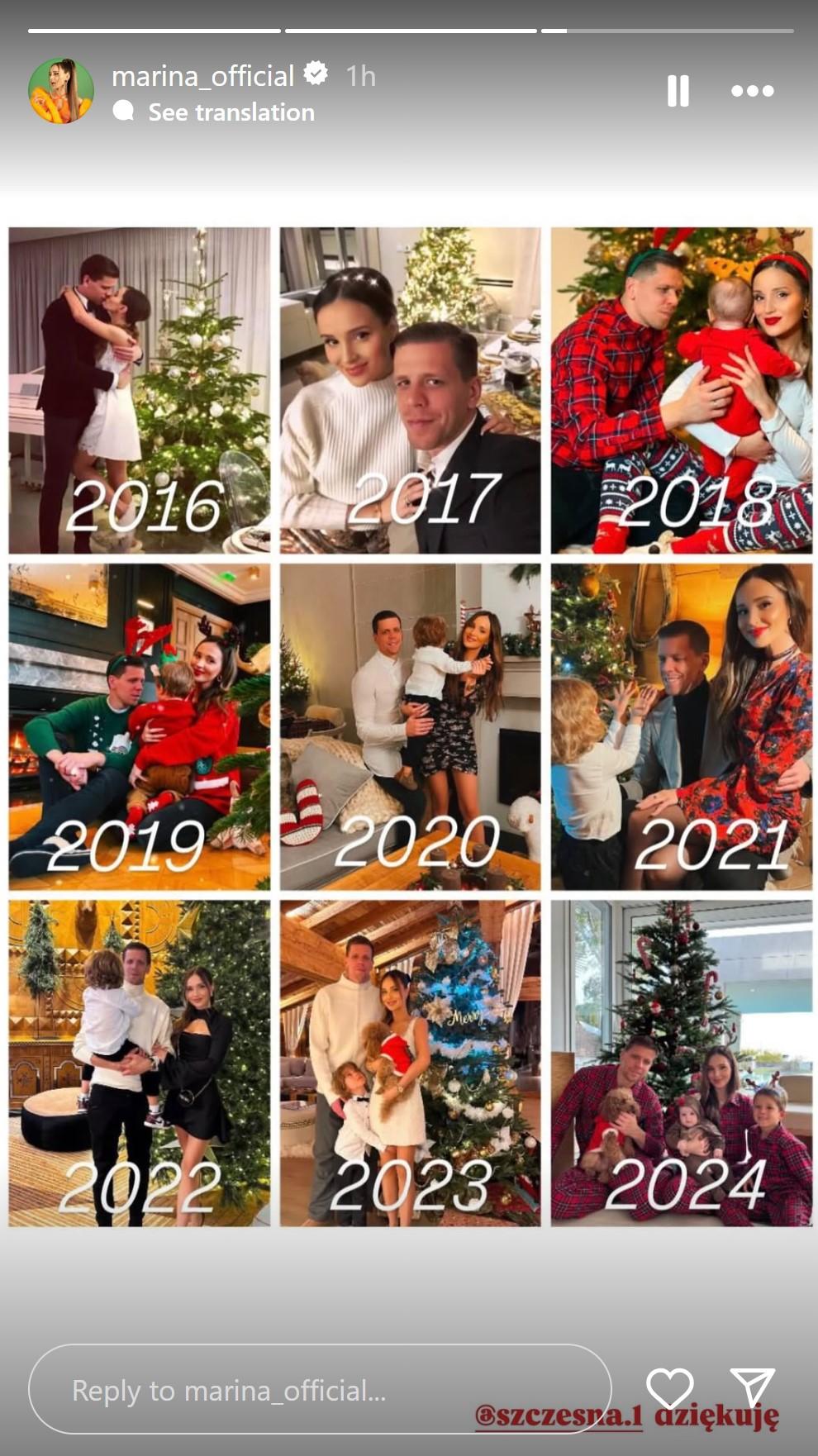 Teraz celebrytka na InstaStories podzieliła się zestawieniem archiwalnych, świątecznych zdjęć zaczynających się na 2016 roku. Na pierwszych dwóch zdjęciach widzimy, jak piosenkarka spędza święta w dwójkę, jedynie w towarzystwie Wojtka. Następnie do rodzinnych fotografii dołącza mały Liam. Zmienia się również otoczenie i choinki, na tle których pozuje cała trójka. Następne zmiany zachodzą w 2023 roku, gdy w życiu rodziny pojawia się piesek oraz w 2024 roku, gdy do zdjęć dołącza ich córeczka.