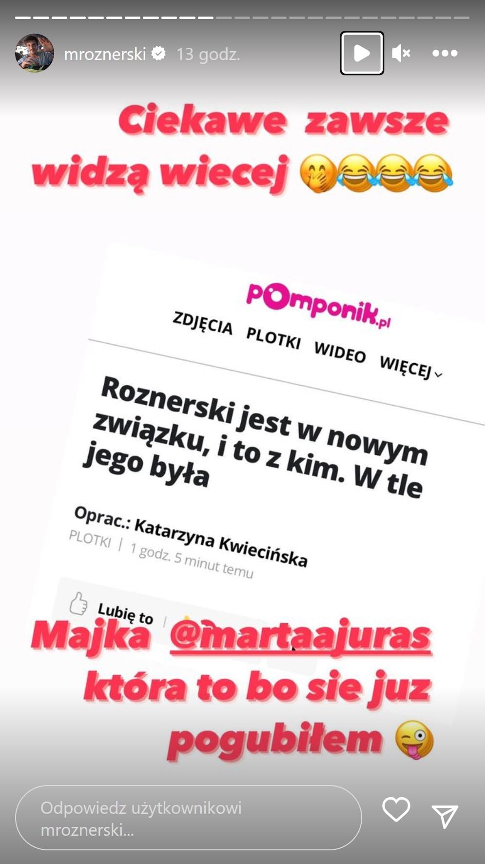 Medialne doniesienia zdecydował się skomentować również sam Roznerski. Aktor opublikował na InstaStories serię relacji, w których wyśmiewa nagłówki deklarujące, że jest w nowym związku. W jednej z nich napisał: “Ja bardzo chętnie poznam to źródło” oraz “Ciekawe, zawsze widzą więcej”. Jednocześnie w kolejnej relacji, aktor enigmatycznie zapowiedział, że zamierza podjąć stanowcze kroki w tej sprawie: