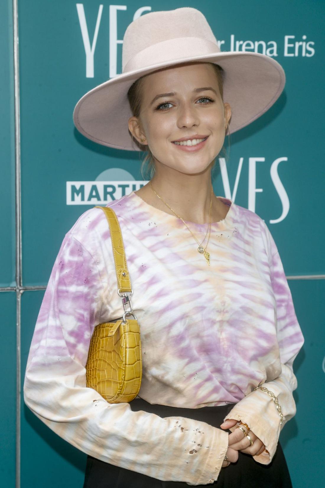 Jessica Mercedes zaprezentowała się w melanżowej bluzce i czarnych spodniach. Fashionistka postawiła na dodatki – duży kapelusz w kolorze brudnego różu, żółtą torebkę i cytrynowe botki.