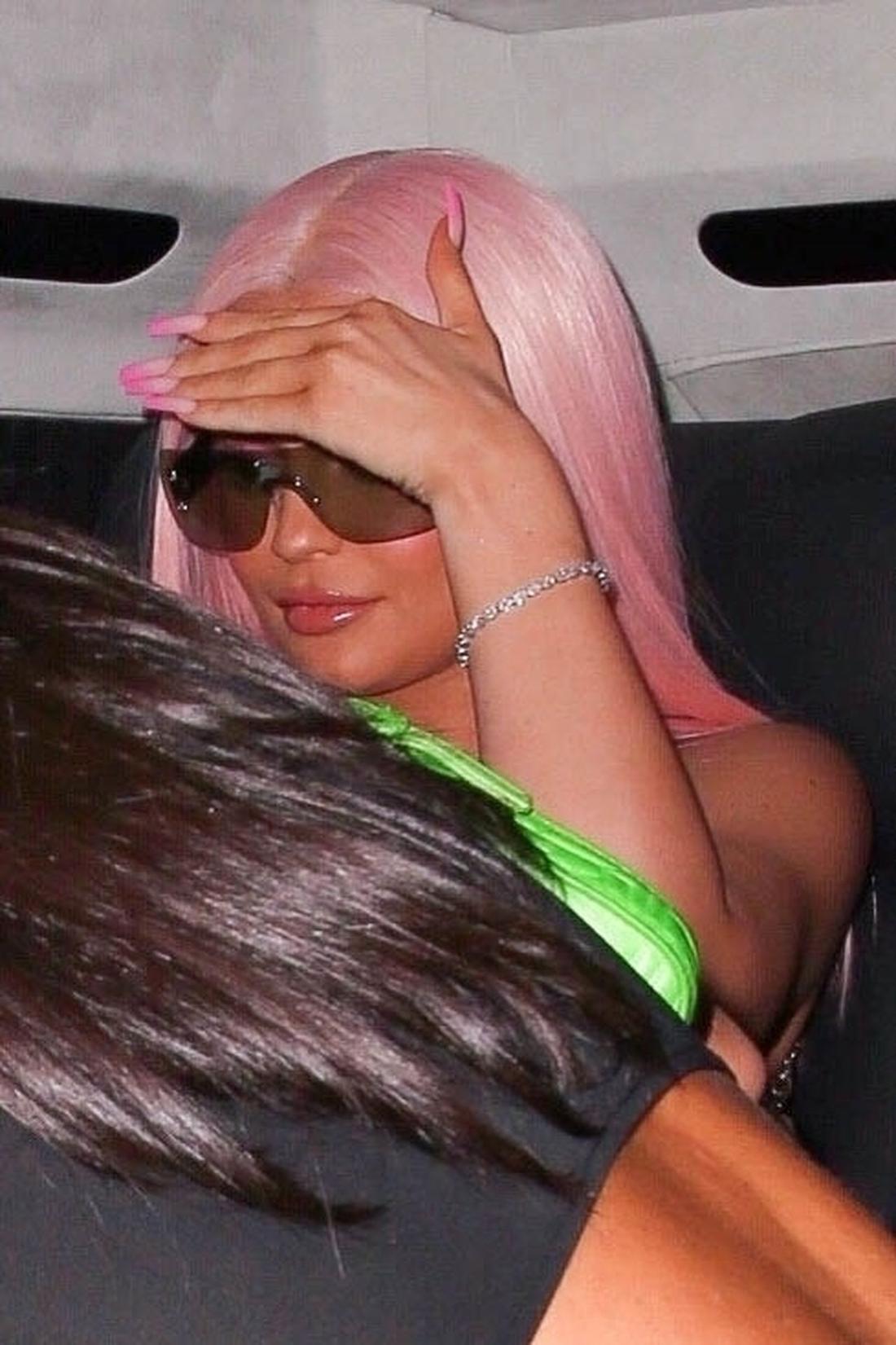 Jennerka odpięła sztuczne pasma, w domu nie nosi też peruki. Swoje naturalne włosy czesze w niedbałego koczka na czubku głowy – część włosów owija frotką, resztę, która jest za krótka, zostawia, by opadła.