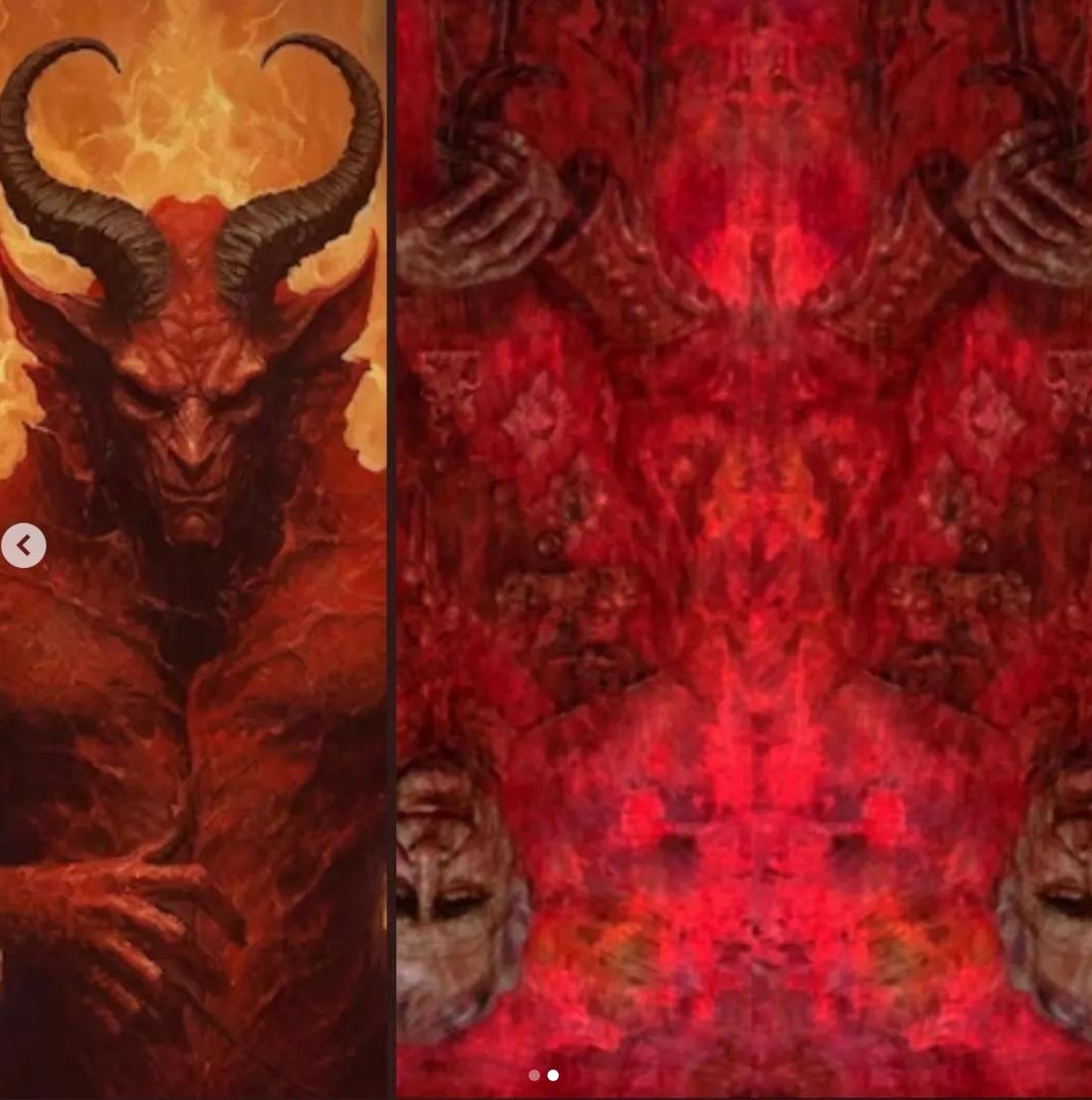 Według jednego z internautów na obrazie jest coś, co do złudzenia przypomina… oko szatana. Inni odnajdują na obrazie poukrywane w pociągnięciach pędzlem twarze, a konto na Instagramie zajmujące się teoriami spiskowymi w Hollywood poszło nawet o krok dalej i obracając oraz kopiując obok siebie portret ujawniło diabelską postać z rogami, która wyłania się z tak połączonych dzieł.
