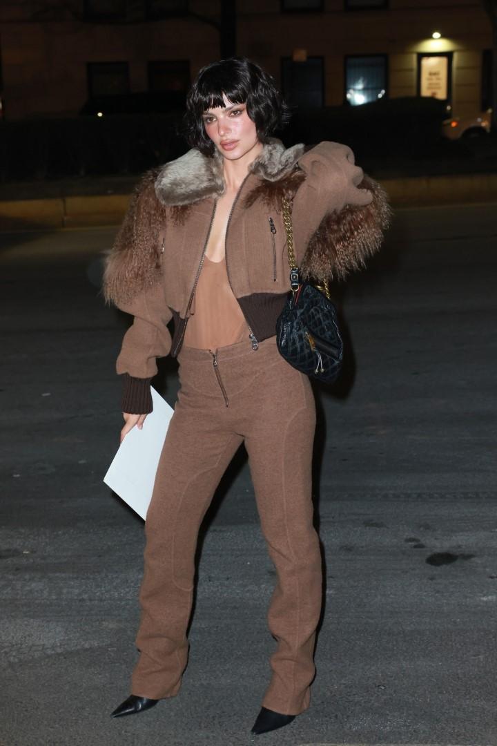 Emily Ratajkowski na pokazie nowej kolekcji Marca Jacobsa po raz kolejny zaprezentowała się w brązach, z którymi ostatnio mocno się polubiła – modelka miała na sobie brązowe spodnie z wysokim stanem i długimi nogawkami zakrywającymi szpilki, brązową koszulkę z głębokim dekoltem i brązową kurtkę obszytą futrzanym kołnierzem.