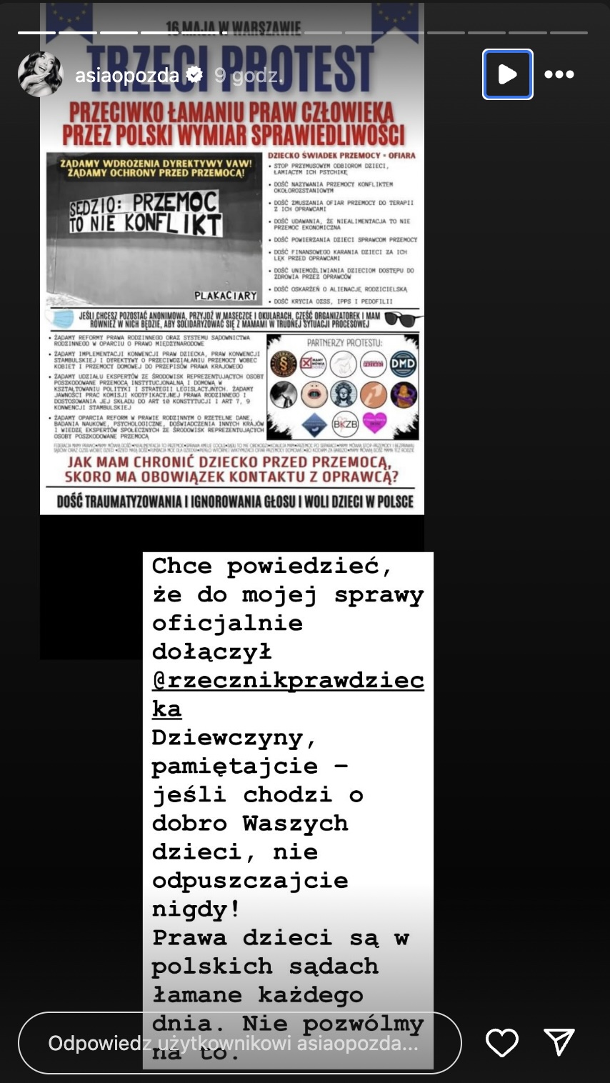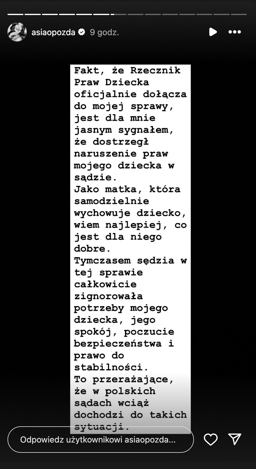Chcę powiedzieć, że do mojej sprawy oficjalnie dołączył Rzecznik Praw Dziecka. Dziewczyny, pamiętajcie – jeśli chodzi o dobro waszych dzieci, nie odpuszczajcie nigdy! Prawa dzieci są w polskich sądach łamane każdego dnia. Nie pozwólmy na to – zaznaczyła.