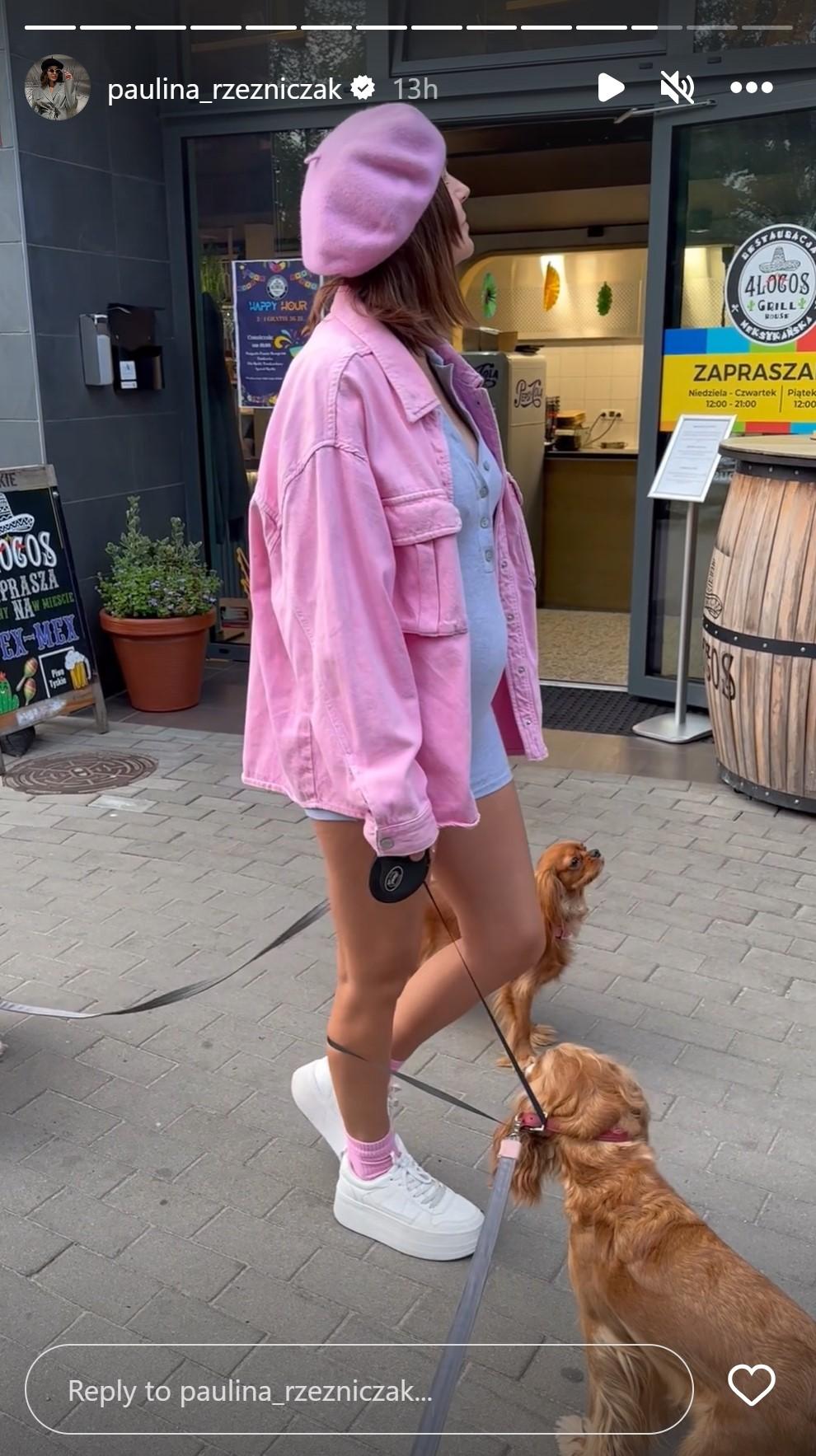 Na szczęście kilka godzin później żona Jakuba Rzeźniczaka poczuła się już na tyle lepiej, że para zdecydowała się wybrać na spacer. W InstaStories pojawiła się relacja z wypadu do kawiarni oraz fotki Pauliny w cukierkowo-różowej stylizacji – wyczekująca na przyjście na świat córeczki mama założyła szary, obcisły kombinezon z króciutkimi szortami i dużym dekoltem, który podkreślił jej duży ciążowy brzuszek, różową oversize’ową kurtkę, różowe skarpety i różowy beret.
