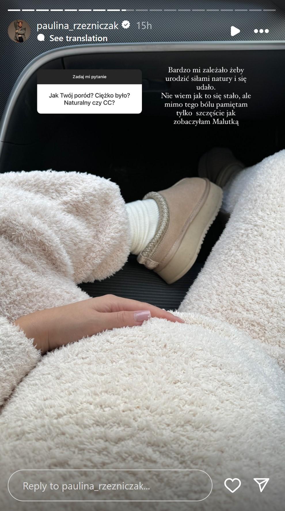 Teraz Paulina znalazłą moment między porami karmienia i przewijania a drzemkami córki, by odezwać się do swoich fanów na Instagramie. Żona Rzeźniczaka w trakcie jazdy samochodem zdecydowała się zorganizować instagramowe Q&A i odpowiedzieć na pytania internautów. W jednej z relacji opowiedziała o przebiegu porodu: