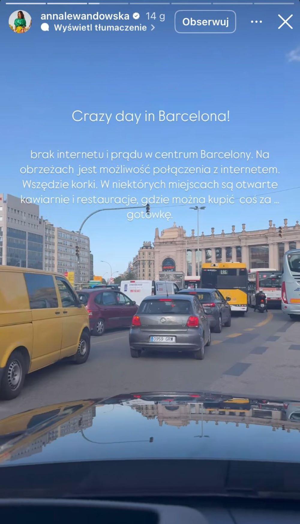 Szalony dzień w Barcelonie. Brak internetu i prądu w centrum Barcelony. Na obrzeżach jest możliwość połączenia z internetem. Wszędzie korki. W niektórych miejscach są otwarte kawiarnie i restauracje, gdzie można kupić coś za gotówkę – pisała na Instagramie Lewandowska.