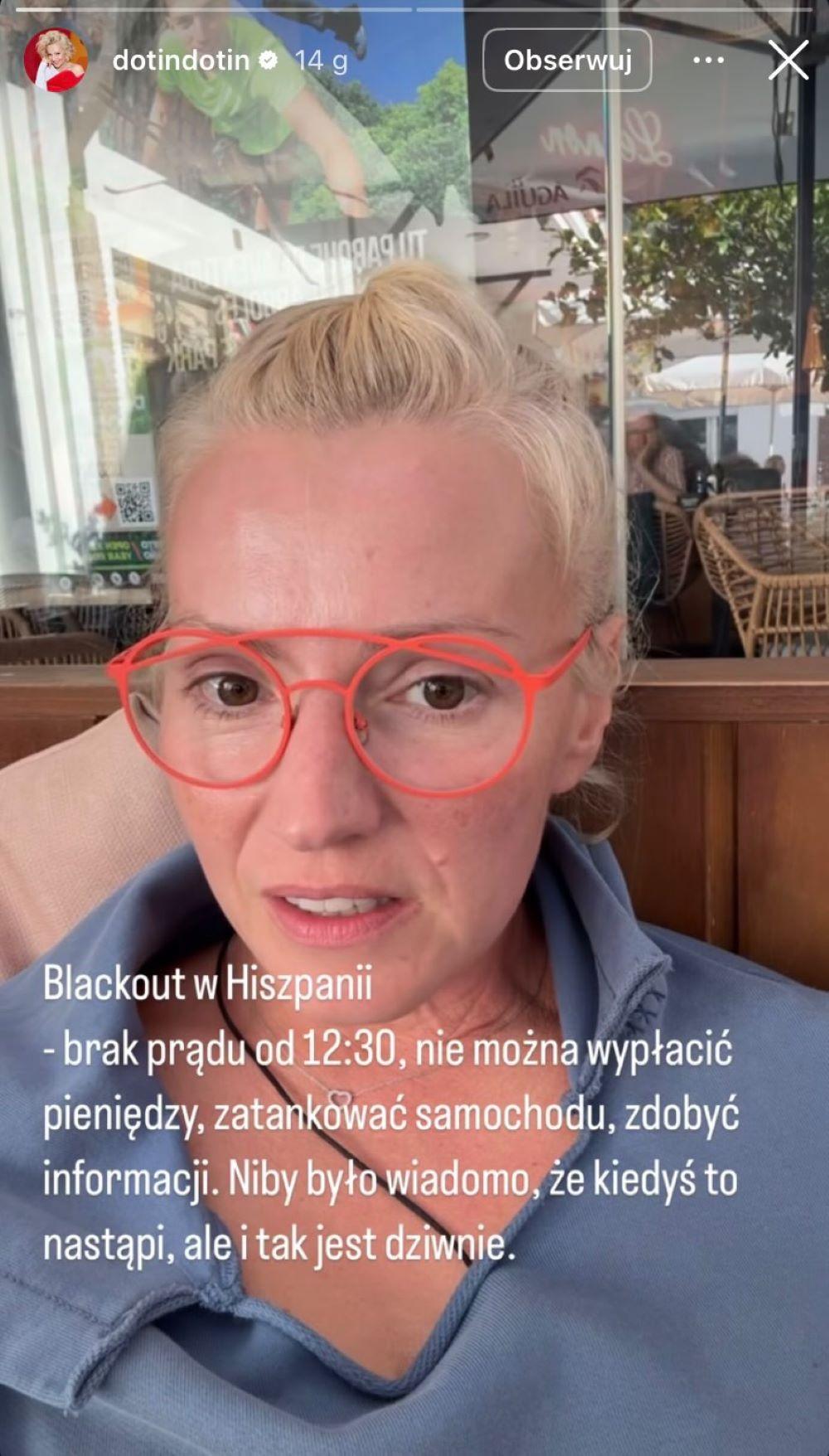 Blackout w Hiszpanii. Brak prądu o 12.30. Nie można wpłacić pieniędzy, zatankować samochodu, zdobyć informacji. Niby było wiadomo, że kiedyś to nastąpi, ale i tak jest dziwnie (…). Generalnie nie mamy pojęcia, co się dzieje. Internet jest raz na parę godzin. Sieć komórkowa też rzadko. Ciekawe doświadczenie, kiedy ludzie w knajpie siedzą wszyscy bez telefonów. Dawno tego nie widziałam. Dziwnie, tyle wam powiem. I jakoś te zapewnienia, że to jest z powodu anomalii pogodowych albo zmian temperatury jakoś do mnie nie przemawiają – wyznała na Instastories Szelągowska.