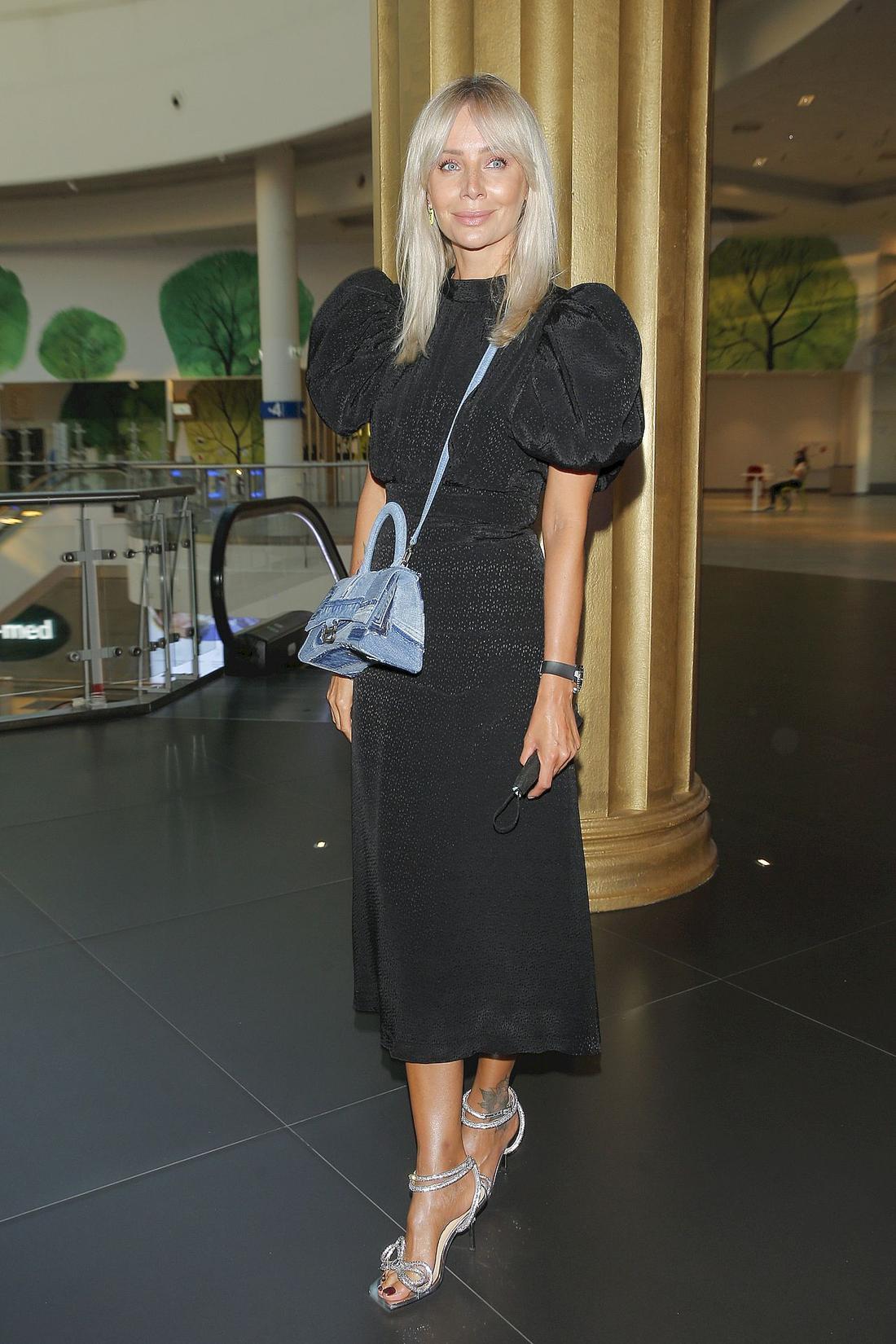rewelacyjnie?, serio? fason sukienki ciekawy, lecz tkanina tandetnie wygladajaca, buty dopasowane, lecz torebka? , chyba doslownie wzieła sobie do serca ten tytuł- czarna owca, nie stworzyla spojnego looku, zepsula go wlasnie ta torebka