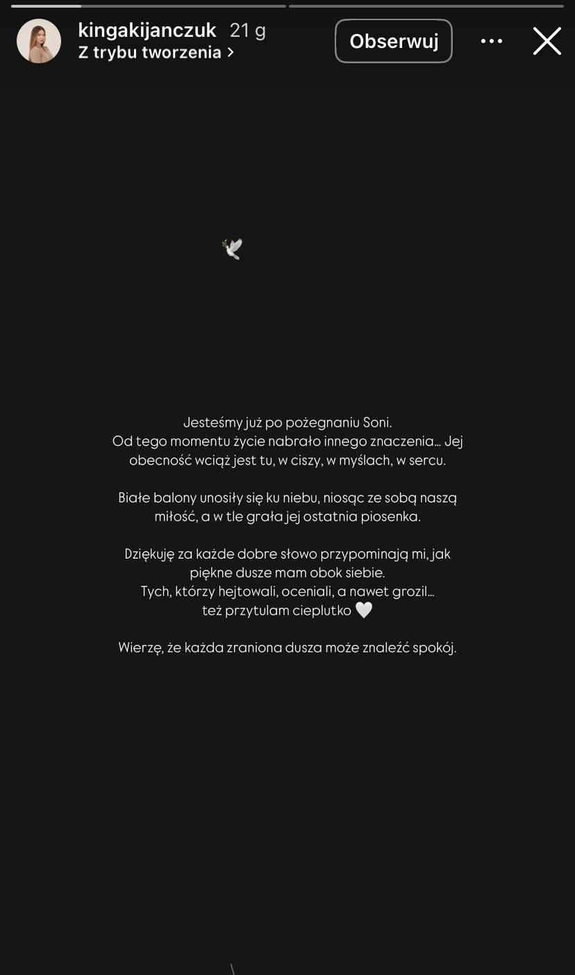 Jesteśmy już po pożegnaniu Soni. Od tego momentu życie nabrało innego znaczenia… Jej obecność wciąż jest tu, w ciszy, w myślach, w sercu. Białe balony unosiły się ku niebu, niosąc ze sobą naszą miłość, a w tle grała jej ostatnia piosenka. Dziękuję za każde dobre słowo. Przypominają mi, jak piękne dusze mam obok siebie. Tych, którzy hejtowali, oceniali, a nawet grozili… też przytulam cieplutko. Wierzę, że każda zraniona dusza może znaleźć spokój – pisała Kinga Kijańczuk na Instagramie.
