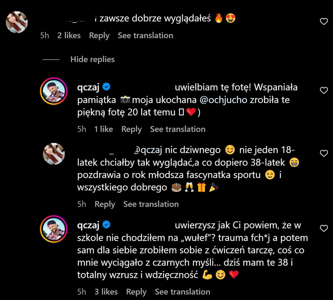 Jednocześnie w odpowiedzi do komentarza jednej z internautek (“I zawsze dobrze wyglądałeś”) Qczaj zdobył się na wyznanie dotyczące jego przeszłości. Okazuje się, że trener w szkole nie znosił w-fu: