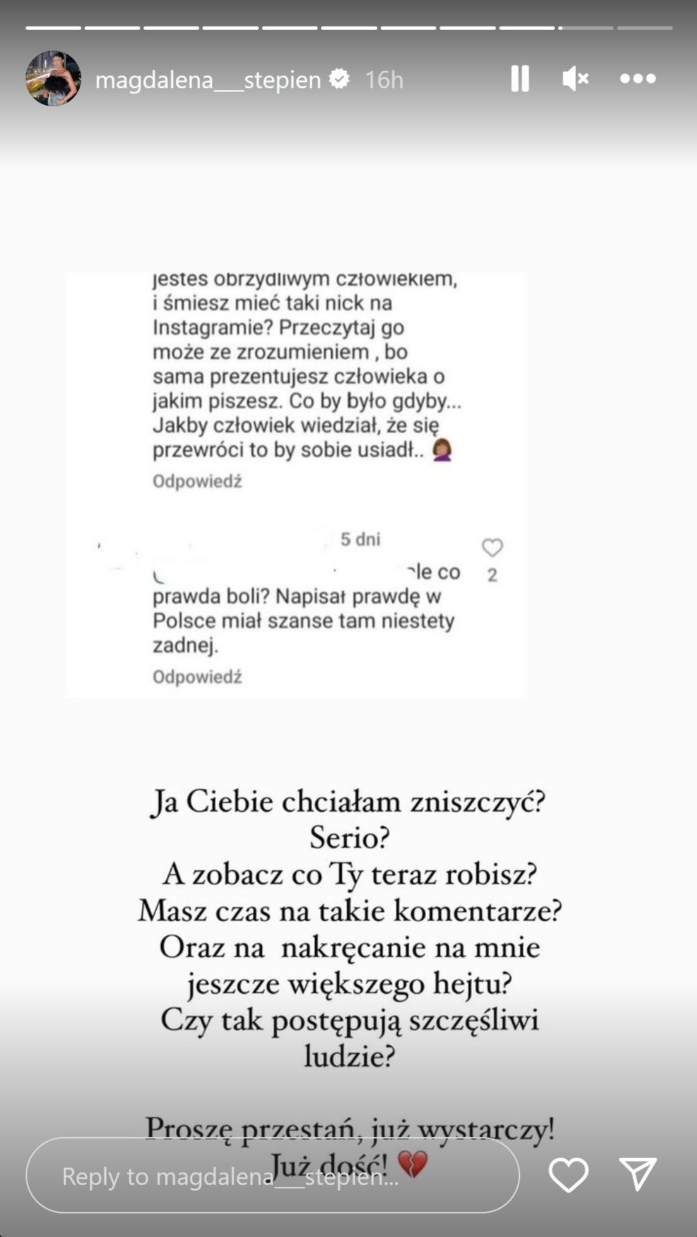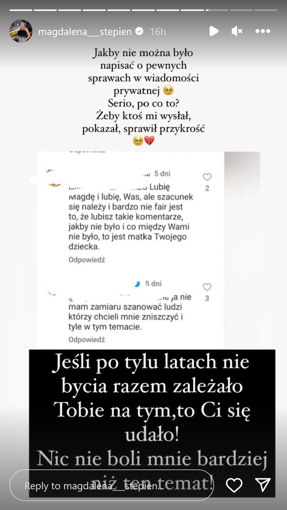 Komentarze dotarły do Magdy Stępień, która choć deklarowała, że nie będzie więcej komentować poczynań Rzeźniczaka, tym razem nie wytrzymała i na serii InstaStories napisała: