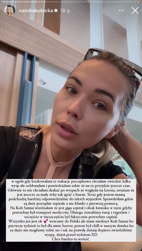 Sandra Kubicka obecnie przebywa na tajlandzkiej wyspie Koh Samui, która była jej wymarzonym kierunkiem. Influencerka nie ukrywa zachwytu, że udało się jej tutaj przyjechać dodatkowo ze swoimi najbliższymi. W tej podróży towarzyszy jej mąż Alek Baron, syn Leoś oraz babcia. Niestety wakacyjną sielankę przerwał pobyt w szpitalu, o którym opowiedziała na swoim Instastories. Kubicka doznała szoku, jak funkcjonują tamtejsze szpitale i porównała je do naszych placówek.