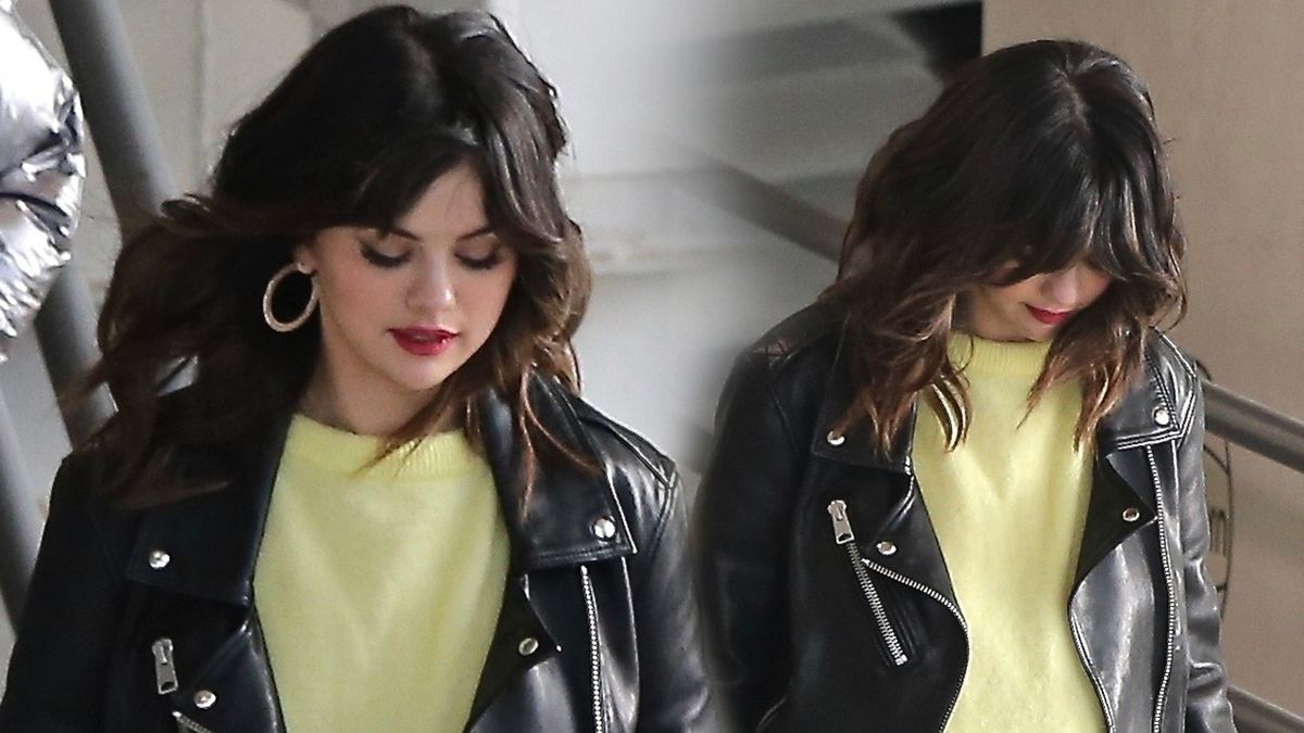 Gwiazda postawiła na rockowy look – miała na sobie luźną, skórzaną ramoneskę i żółty sweter. Założyła luźne jeansy z postrzępionymi nogawkami, które świetnie współgrały z seksownymi, czarnymi botkami na cienkiej szpilce. Podziwiamy Selenę, że dała w nich radę zejść po schodach!