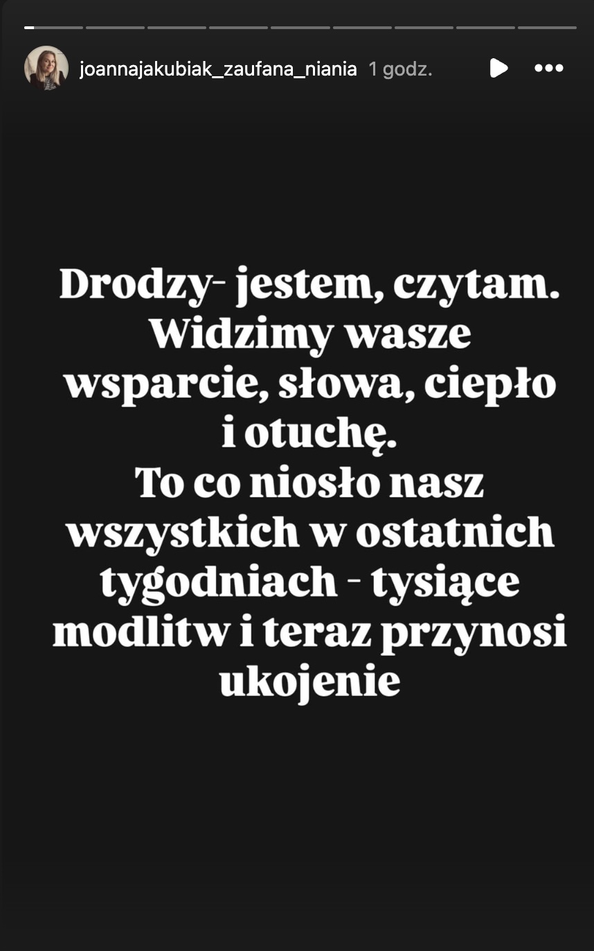 Drodzy, jestem, czytam. Widzimy Wasze wsparcie, słowa, ciepło i otuchę. To, co niosło nas wszystkich w ostatnich tygodniach – tysiące modlitw, teraz przynosi ukojenie – napisała Joanna.