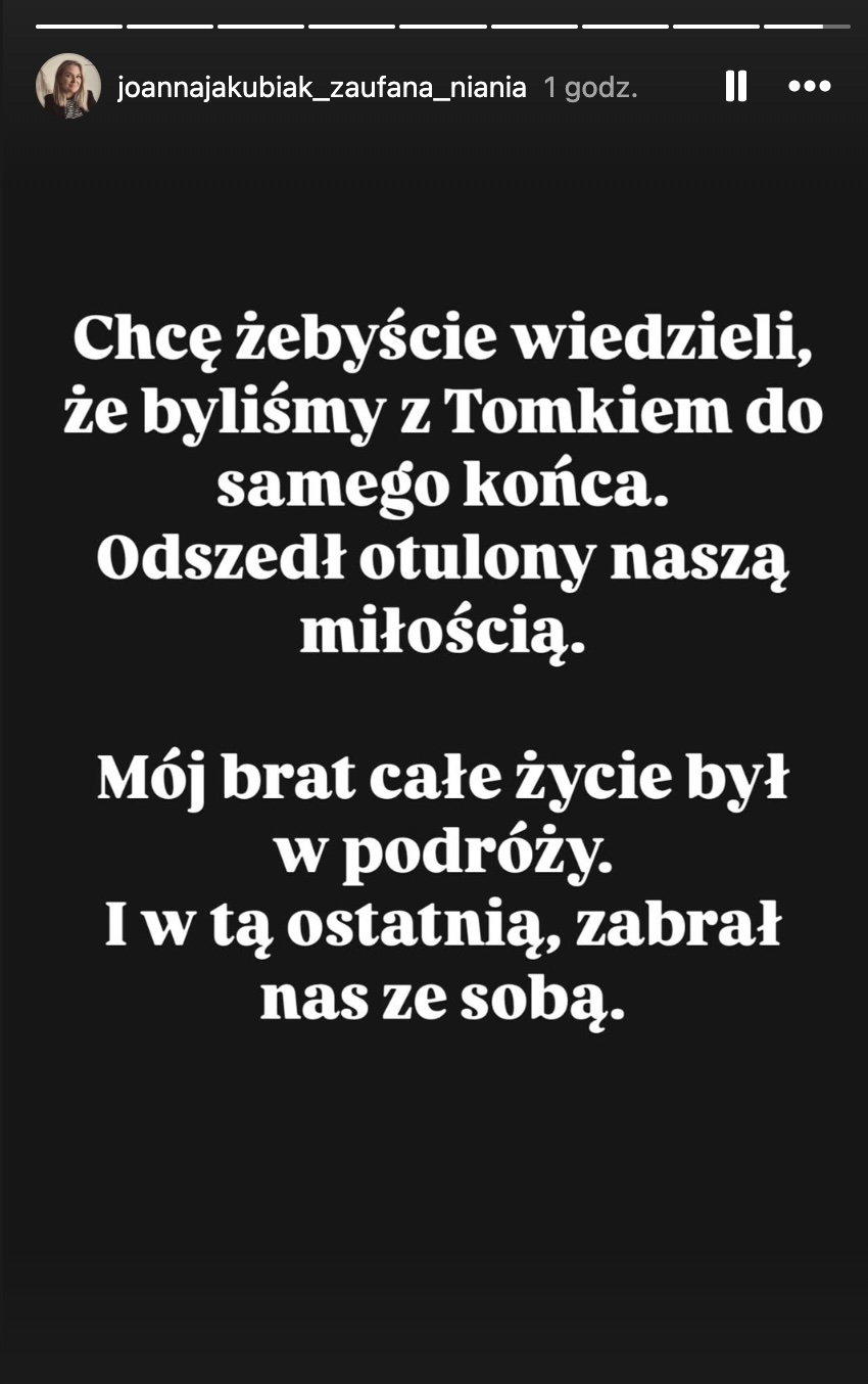 Poruszający gest wykonała także jego siostra, która pożegnała go jednym słowem: “Braciszku” oraz opublikowała czarno-białe zdjęcie uśmiechniętego Tomka. Następnego dnia Joanna Jakubiak zabrała głos. Przyznała, że dobre słowa i modlitwy przynoszą ukojenie: