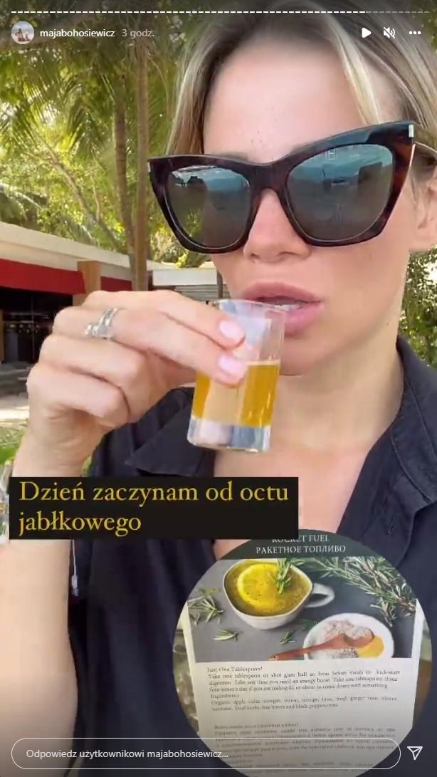 Teraz za jej przykładem postanowiła pójść starsza siostra – Sonia Bohosiewicz. Na swoim Instagramie zaprezentowała trend podpatrzony u Mai, a konkretniej picie octu jabłkowego na czczo zaraz po przebudzeniu. Jak możemy wyczytać w internecie, roztwór zawierający 1-2 łyżki octu jabłkowego należy pić 20 minut przed posiłkiem. Picie roztworu ma wiele pozytywnych efektów przy leczeniu różnych schorzeń oraz wspomaga chudnięcie. Nie powinny go jednak stosować osoby, które cierpią na przewlekłe choroby związane z układem pokarmowym i żołądkiem oraz wątrobą. Czyżby Sonia Bohosiewicz należała właśnie do tej kategorii? Zaczęło się niewinnie, na pierwszym filmiku pokazała jak bierze łyk “magicznego” napoju i tłumaczy skąd wzięła pomysł: