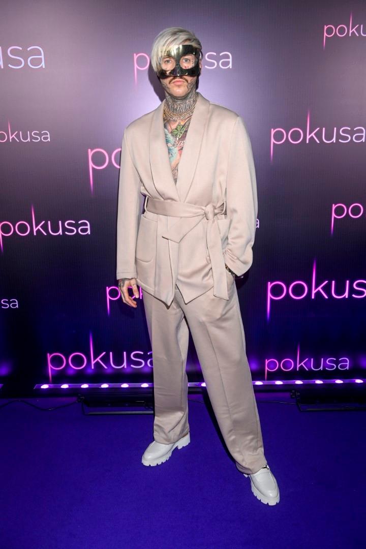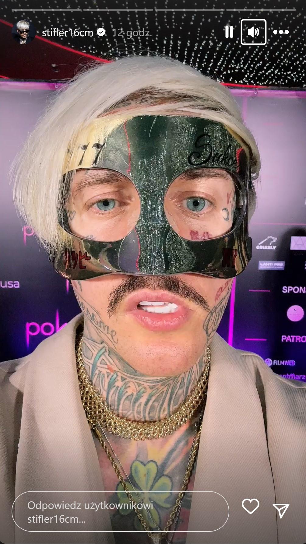 Na premierze filmu “Pokusa”, Damian Zduńczyk znany w sieci pod pseudonimem Stifler pojawił się w nietypowej stylizacji. Gwiazdor znany z programu “Warsaw Shore”, który w “Pokusie” zagrał odważną scenę łóżkową zapozował na ściance w beżowych spodniach i marynarce przewiązanej w talii paskiem oraz… złotej masce na twarzy.