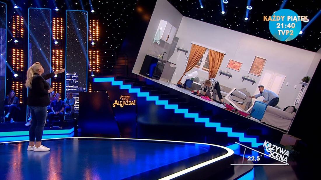 Jednym z elementów show jest tak Krzywa Scena, gdzie zaproszeni goście mają odgrywać scenki, których narracja jest przekazywana przez prowadzącą program Elżbietę Romanowską. Pochylona pod kątem 22 stopnia scena jest jedynym elementem, na którym budowany jest dowcip. Każdorazowo przebieg wygląda bardzo podobnie: prowadząca krzyczy, uczestnicy krzyczą, jest rozrzucane jedzenie i rozlewane płyny, prowadząca się cieszy, uczestnicy się cieszą, widownia się cieszy. Karuzela śmiechu porównywalna rodem z “Chwili dla ciebie”.