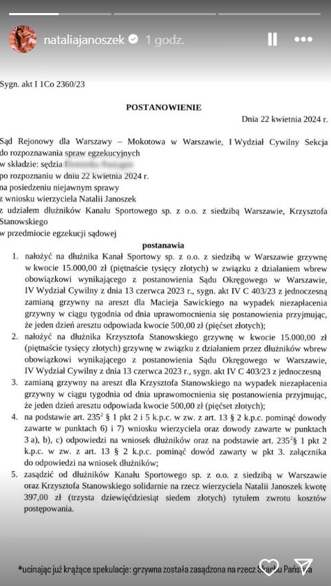 To zdecydowanie dobry dzień dla Natalii Janoszek. Celebrytka, która kilka miesięcy temu została skompromitowana przez Krzysztofa Stanowskiego, opublikowała w sieci postanowienie sądu. Jak wynika z dokumentu znany dziennikarz i Kanał Sportowy muszą zapłacić grzywnę za niedostosowanie się do wcześniej wydanego zakazu publikacji na temat 33-latki.
