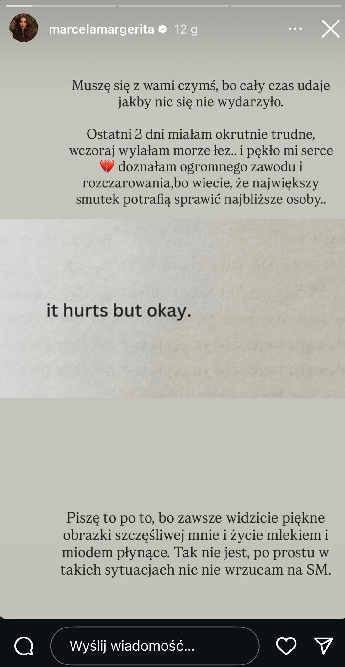 Muszę się z Wami czymś podzielić, bo cały czas udaję, jakby nic się nie wydarzyło. Ostatnie dwa dni miałam okrutnie trudne. Wczoraj wylałam morze łez i pękło mi serce. Doznałam ogromnego zawodu i rozczarowania, bo wiecie, że największy smutek potrafią sprawić najbliższe osoby… – napisała.
