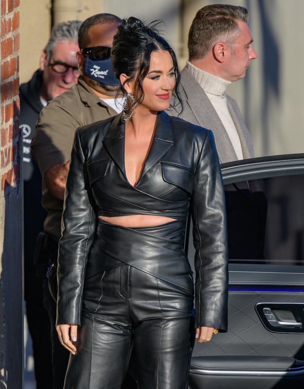 Choć niewątpliwie Katy Perry słynie z dziwacznych przebrań podczas swoich koncertów nikt nie spodziewał się zobaczyć jej w takim stroju pod studiem nagraniowym show Jimmy’ego Kimmela. Piosenkarka udała się do studia w “normalnym” stroju. Skórzany, czarny kombinezon podkreślał jej sylwetkę, zaprzeczając tym samym ostatnie domysły odnośnie drugiej ciąży artystki.
