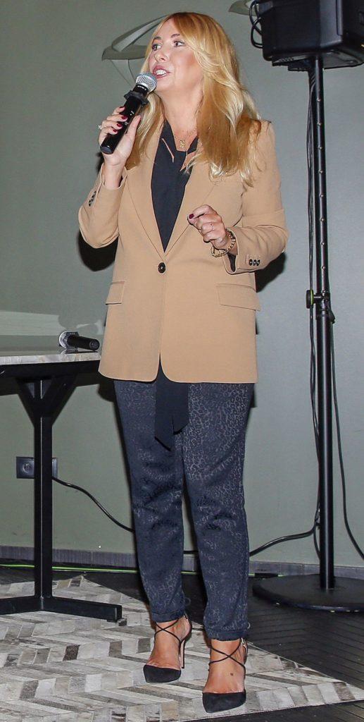 Żona kucharza wyglądała świetnie w brązowej marynarce i modnych szpilkach.