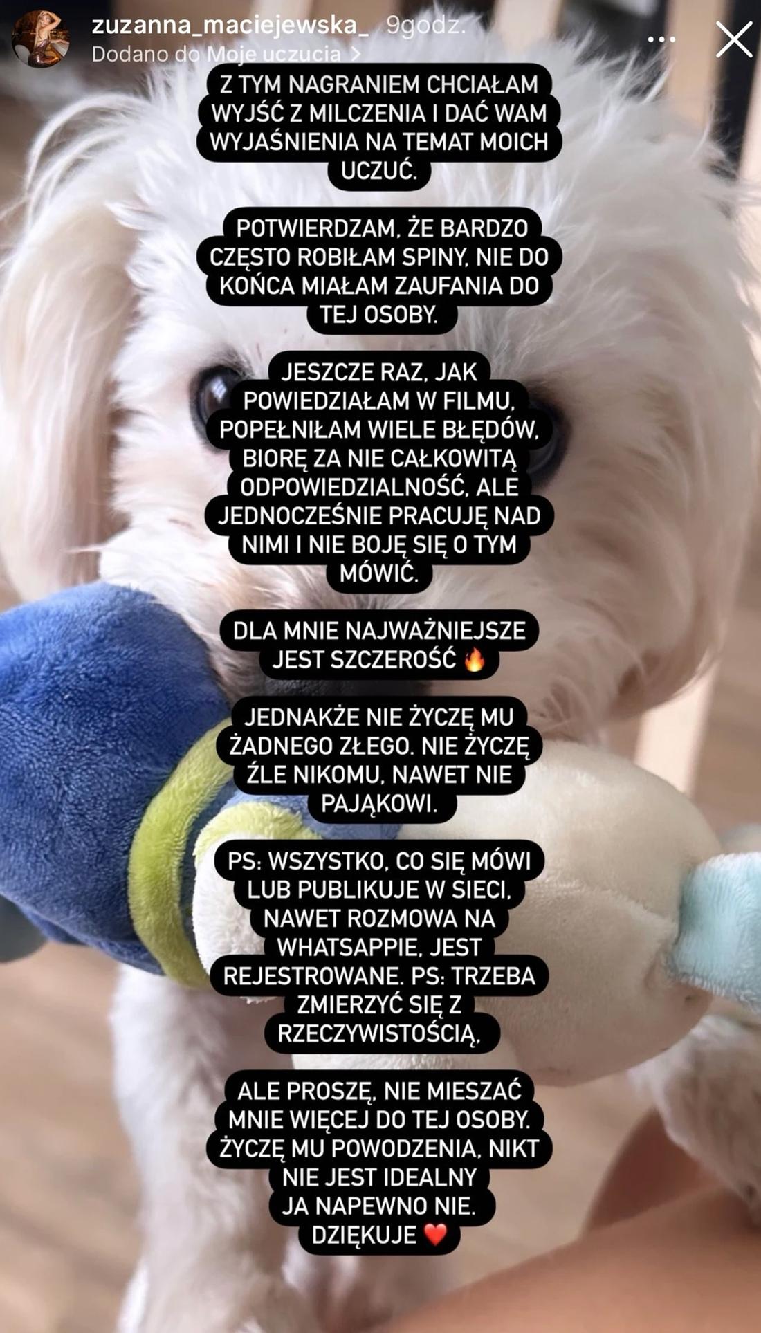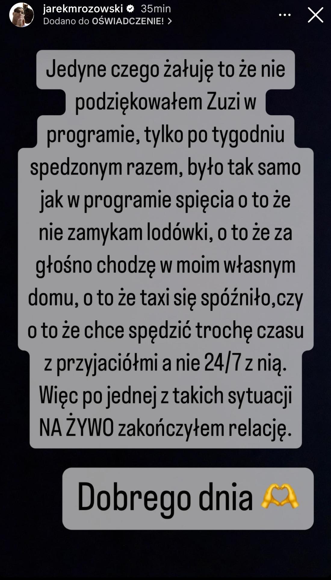 Moja relacja z Zuzą dobiegła końca, nie jesteśmy już razem. Nigdy złego słowa o niej nie powiem, bo wiele wyniosłem z tej relacji. I przepraszam wszystkich widzów, którzy nam kibicowali, ale życie nas zweryfikowało. I jako wygrana para, chyba rozchodzimy się jako pierwsi. Wszystkiego dobrego Zuzanno – napisał na Instagramie.
